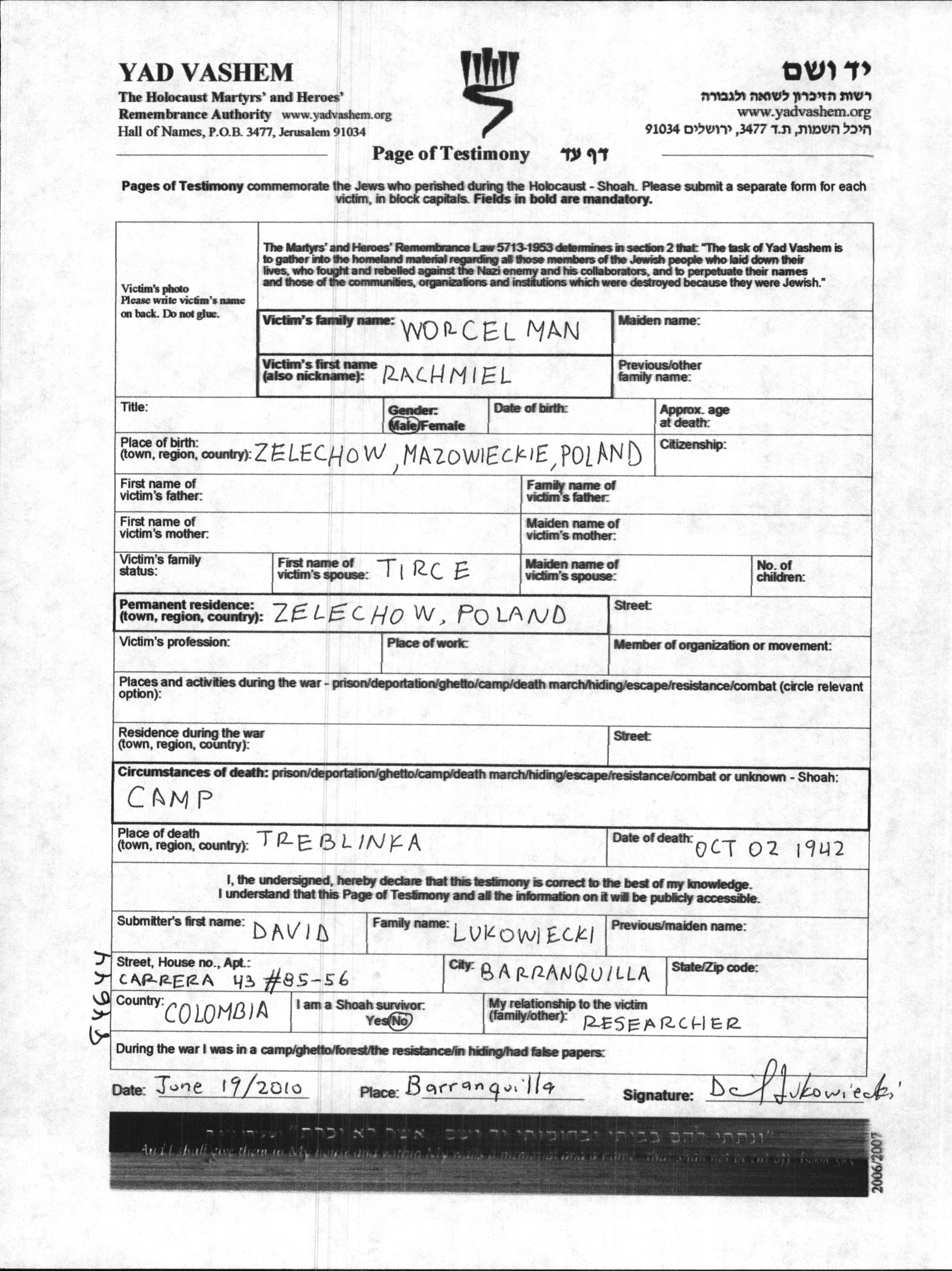 Rachmiel Worcelman wurde in Zelechow, Polen geboren. Er war mit Tirce Verheiratet. Vor dem Zweiten Weltkrieg lebte er in Zelechow, Polen.