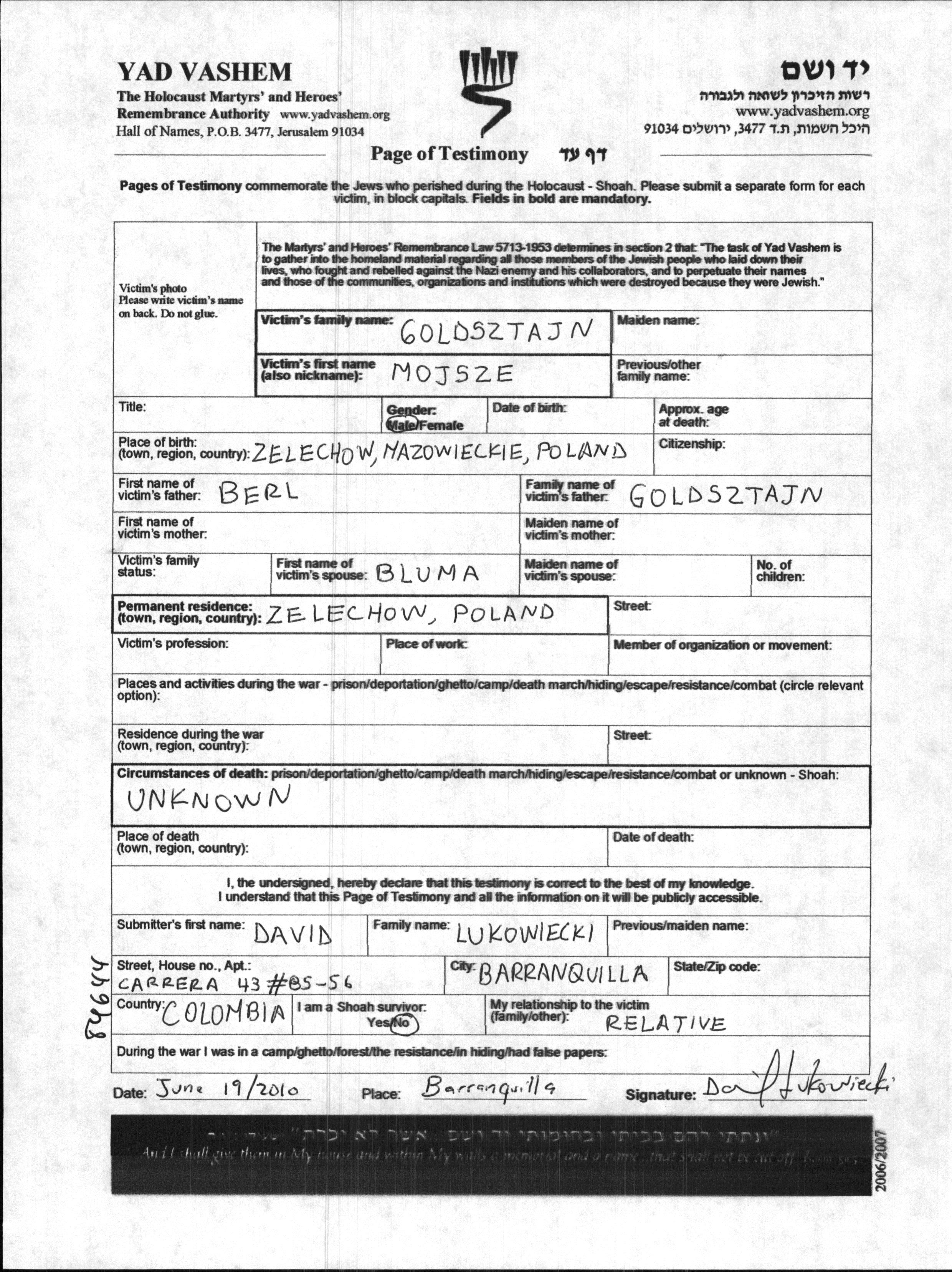 Goldsztajn Mojsze Zelechow, Polen Gedenkblatt