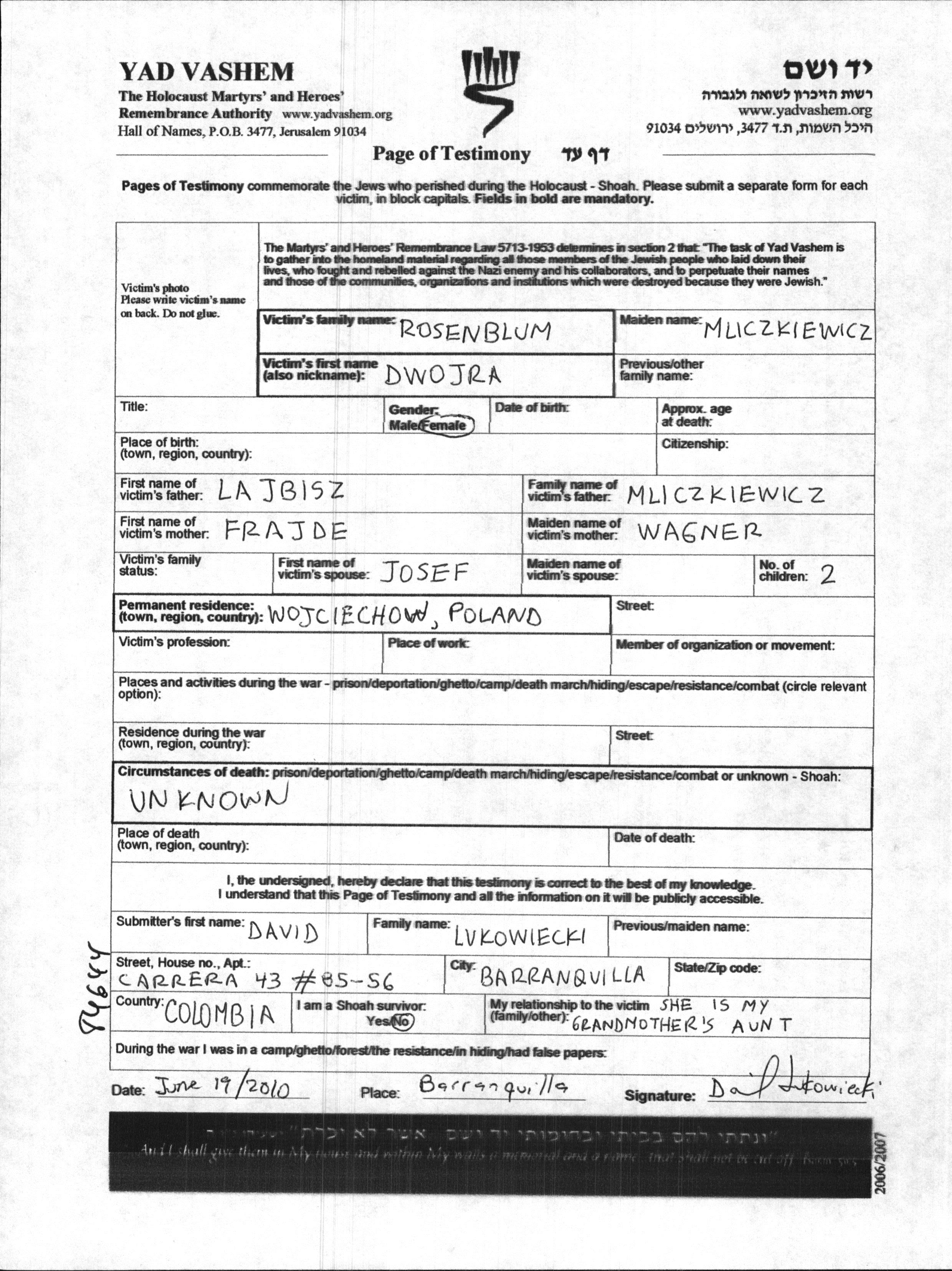 Dwojra Rosenblum, geb. Mliczkiewicz wurde Sie war die Tochter von Lajbisz und Frajde, geb. Wagner. Sie war mit Josef Verheiratet.
