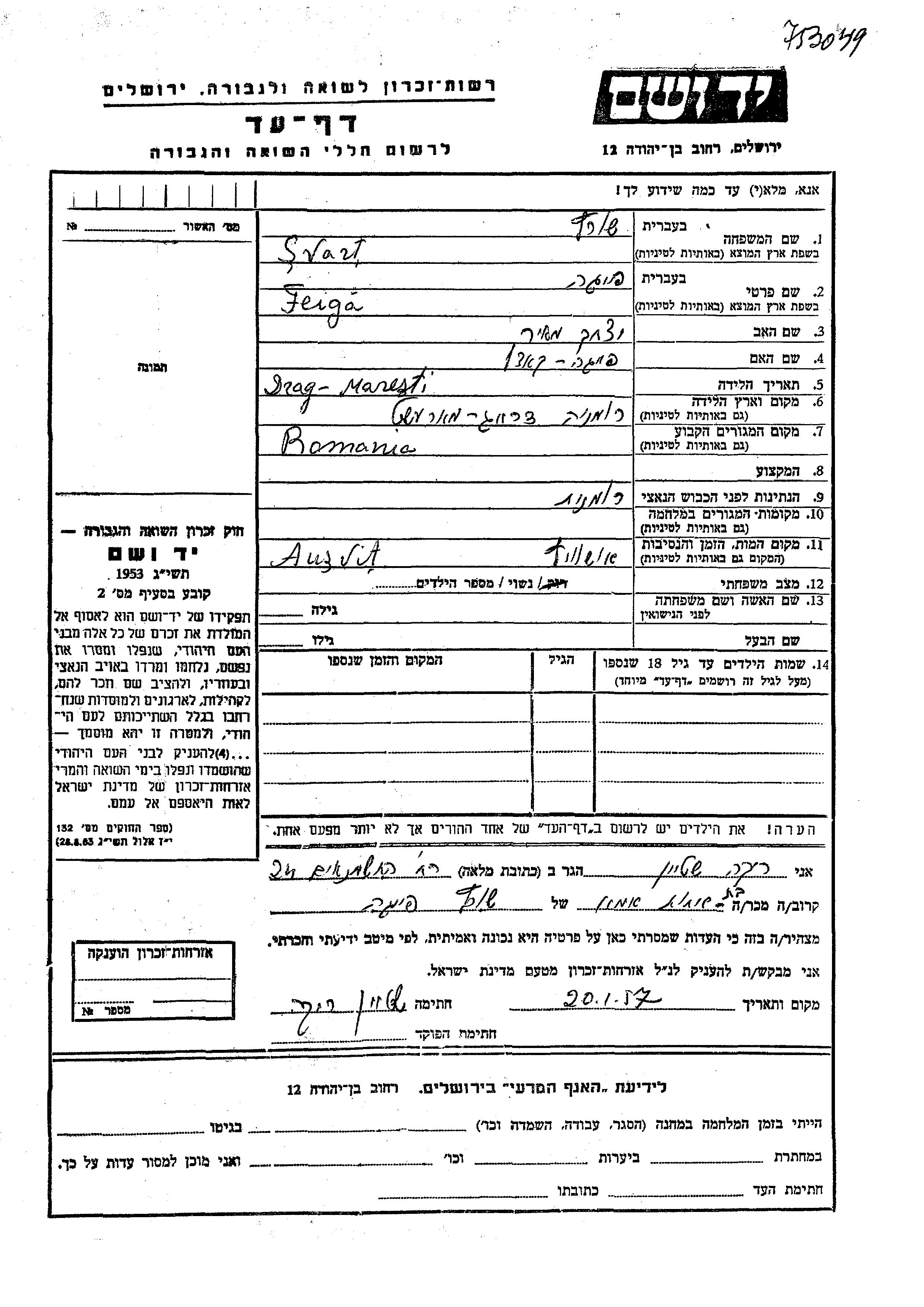 Svart Shvartz Feiga Rumänien Gedenkblatt