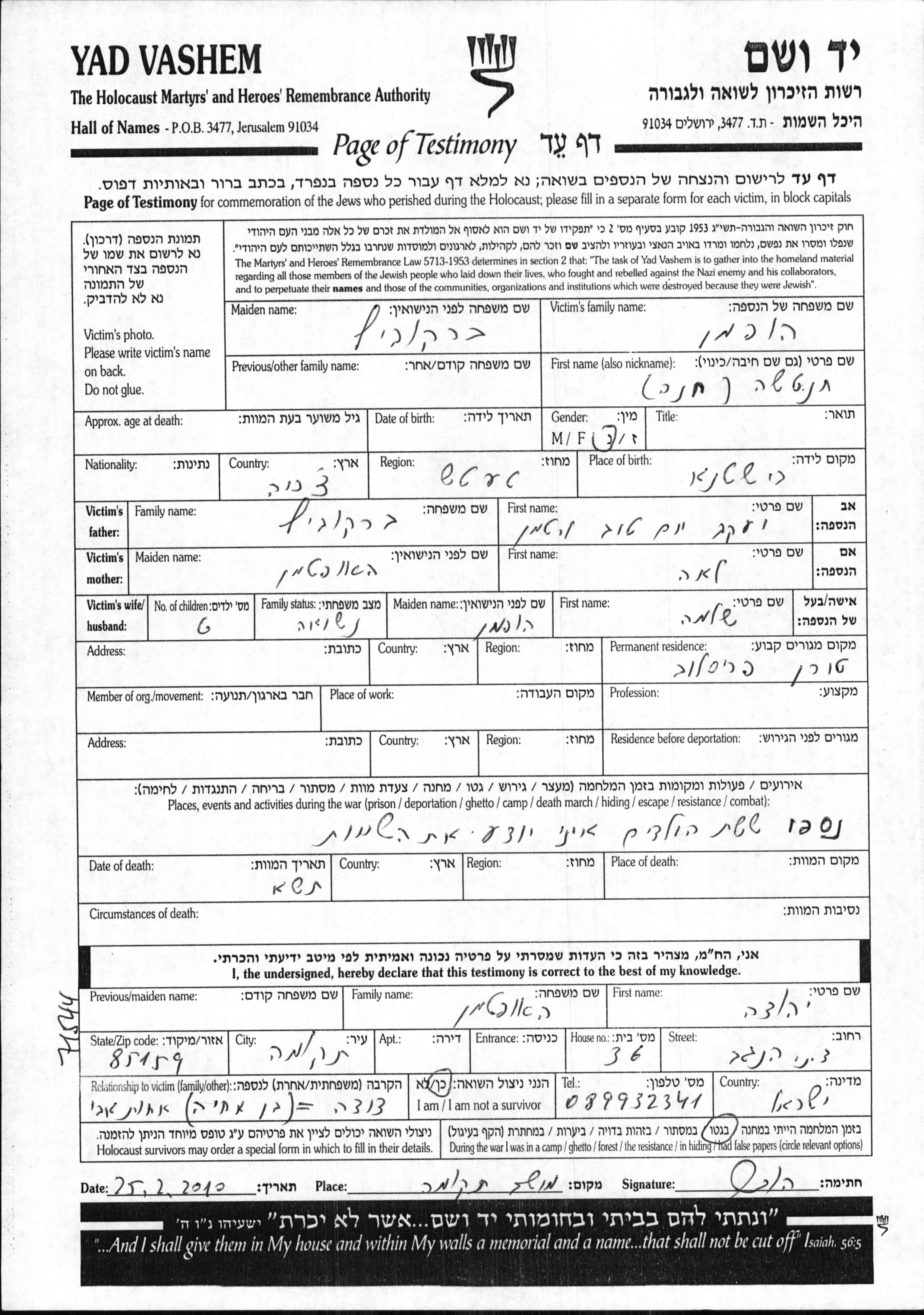 Khana Hofman, geb. Berkovitz wurde in Bustina, Tschechoslowakei geboren. Sie war die Tochter von Yaakov Yom Tov Litman und Lea, geb. Hauptman. Sie war mit Shlomo Verheiratet. Vor dem Zweiten Weltkrieg lebte sie in Toren, Tschechoslowakei.