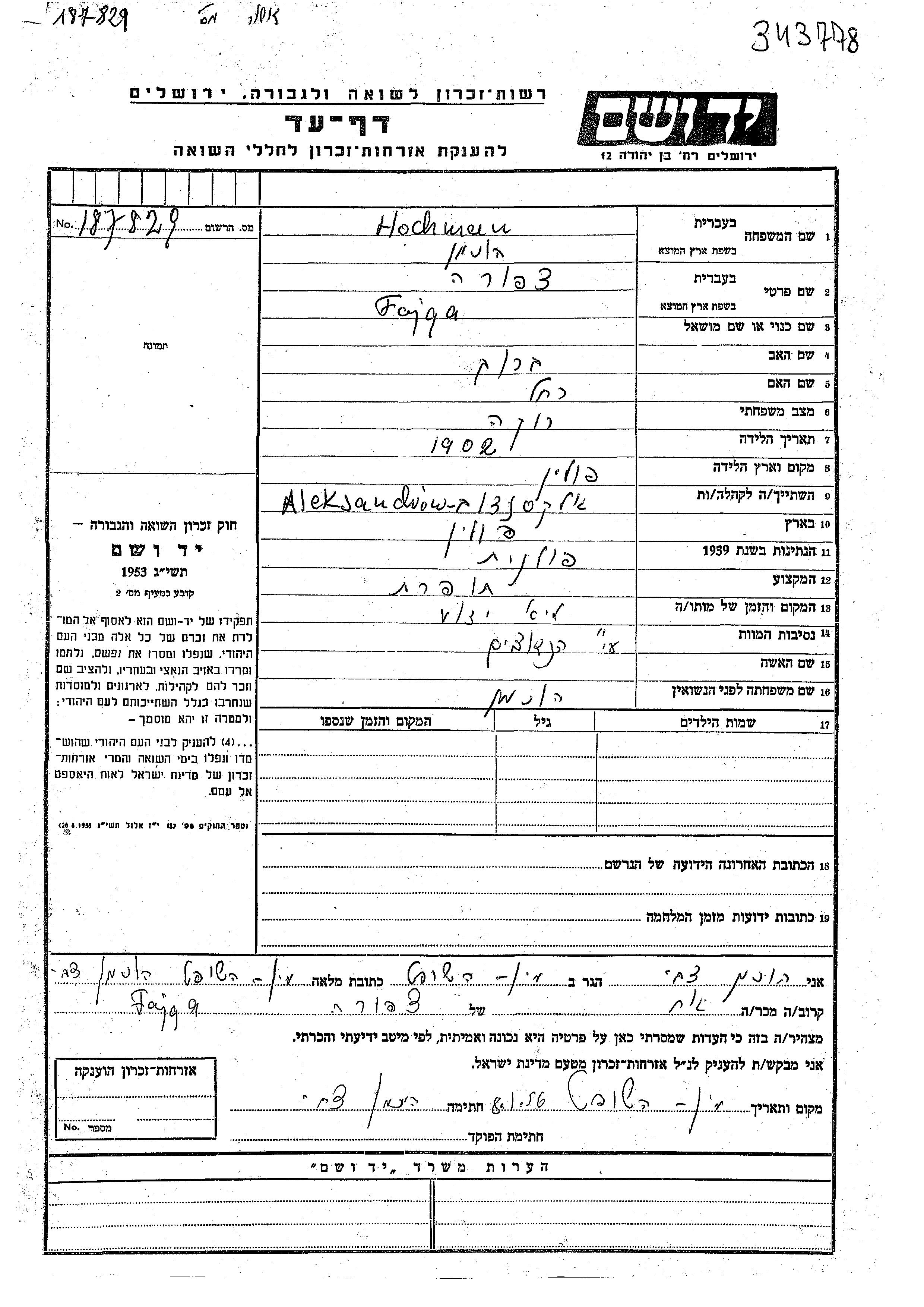 Hochman Fajga Tzipora 1902 Aleksandrov, Polen Gedenkblatt