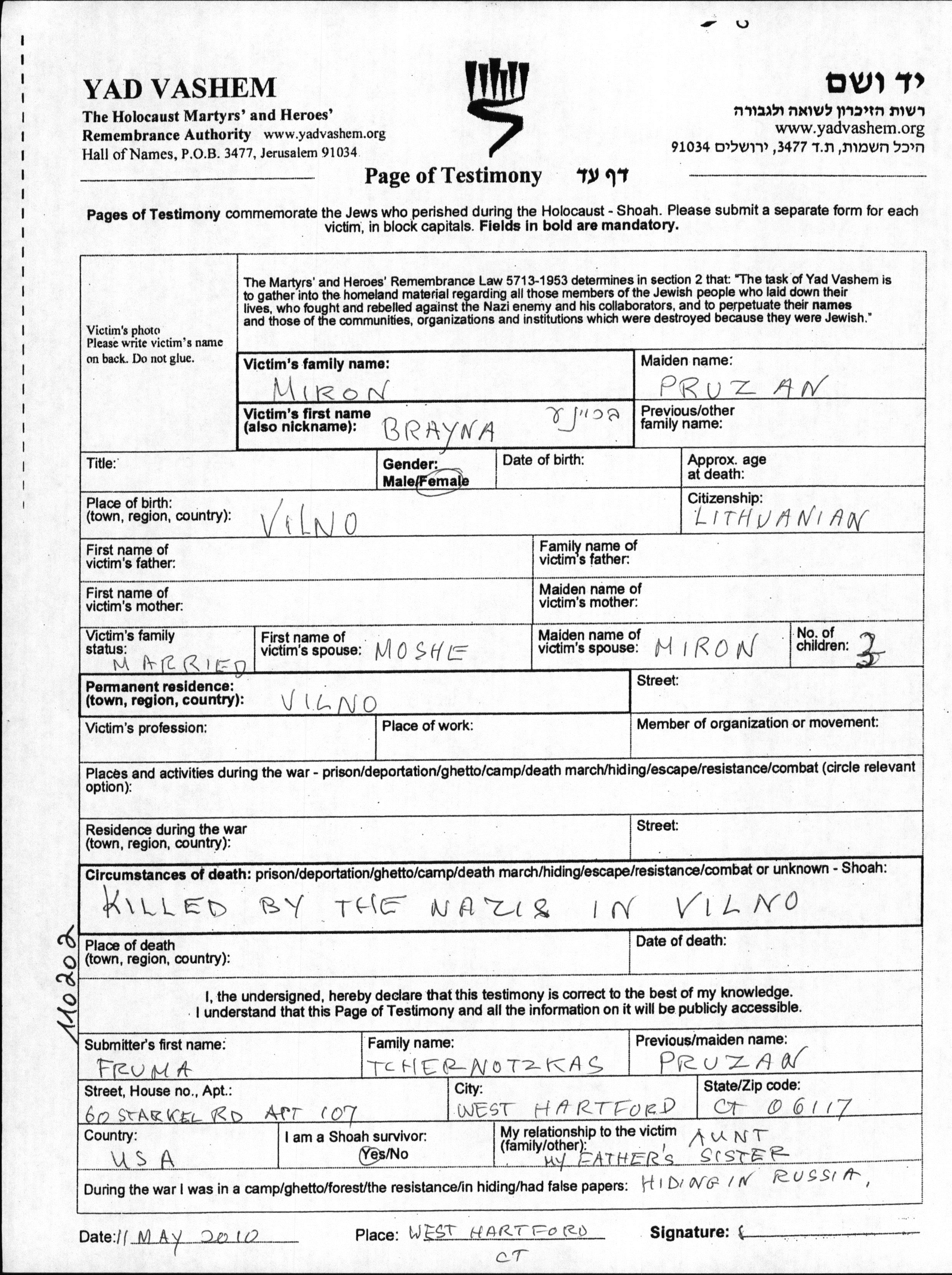 Brayna Miron, geb. Pruzan wurde in Wilno, Polen geboren. Sie war mit Moshe Verheiratet. Vor dem Zweiten Weltkrieg lebte sie in Wilno, Polen. Während des Krieges war sie in Wilno, Polen.