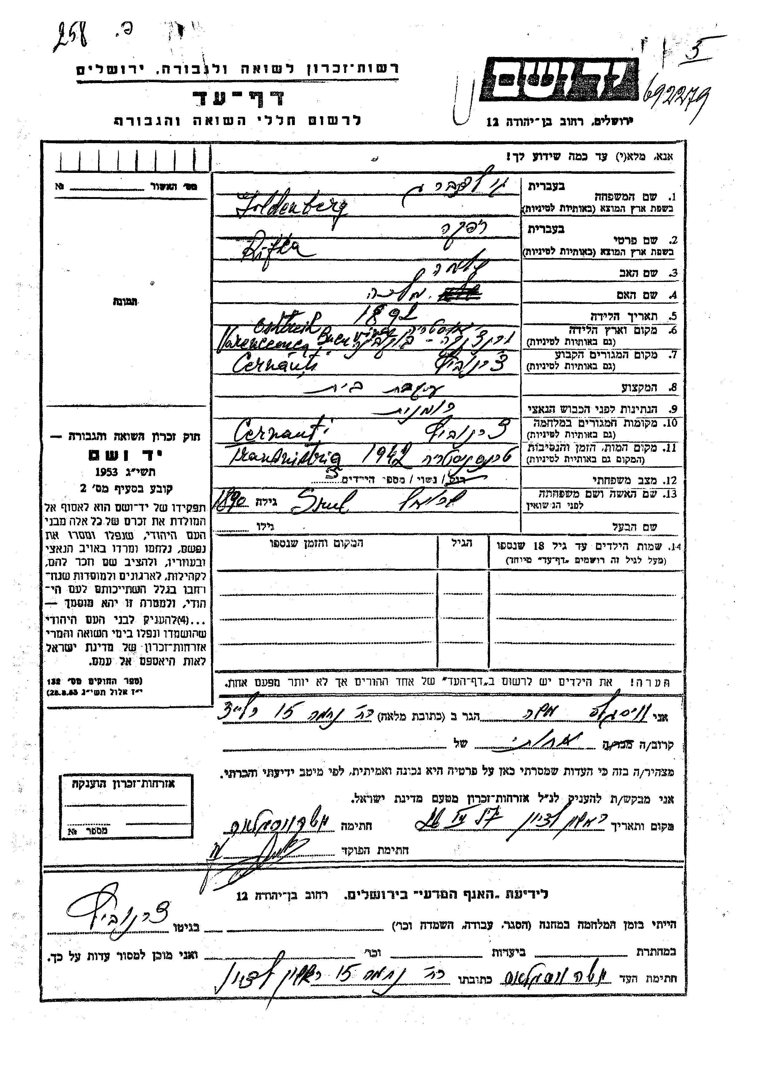 Rivka Gildenberg Goldenberg, geb. Shrol Srul wurde im Jahr 1892 in Vranceni, Rumänien geboren. Sie war die Tochter von Shlomo und Malka. Sie war Hausfrau und mit Srul Verheiratet. Vor dem Zweiten Weltkrieg lebte sie in Cernauti, Rumänien. Während des Krieges war sie in Cernauti, Rumänien.