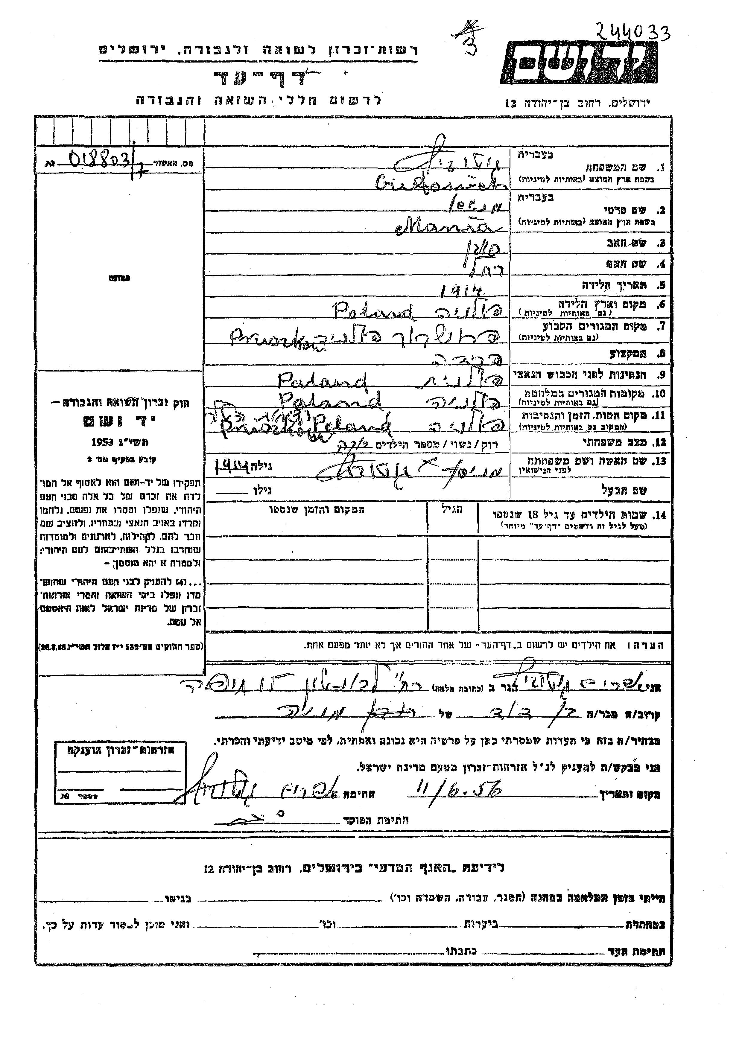 Mania wurde in der Schoah ermordet. Todesort: Pruszkow, Polen.