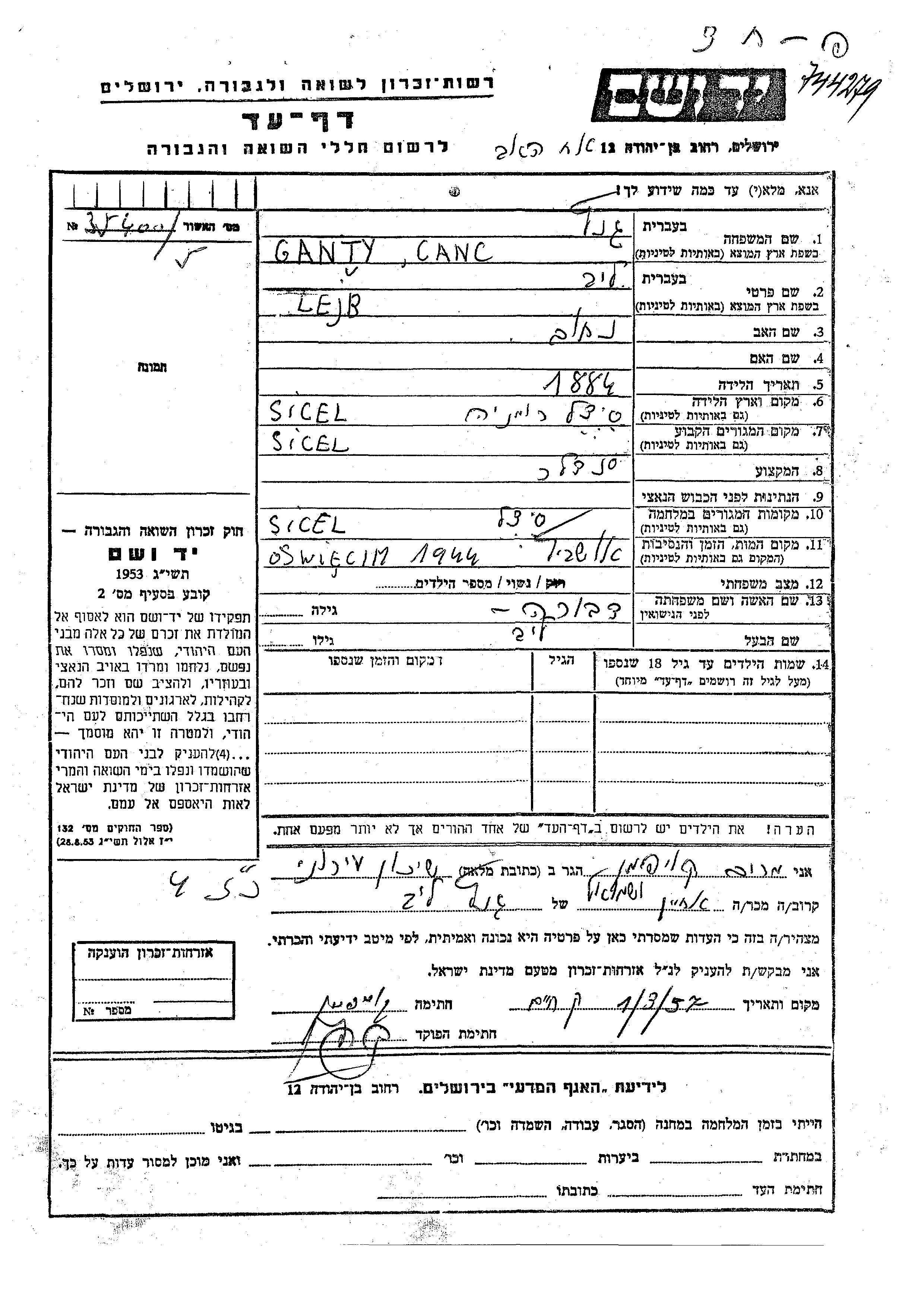 Lejb Ganty wurde im Jahr 1884 in Sicel, Rumänien geboren. Er war der Sohn von Nakhum. Er war Schuster/-in und mit Dvora Verheiratet. Vor dem Zweiten Weltkrieg lebte er in Sicel, Rumänien. Während des Krieges war er in Sicel, Rumänien.
