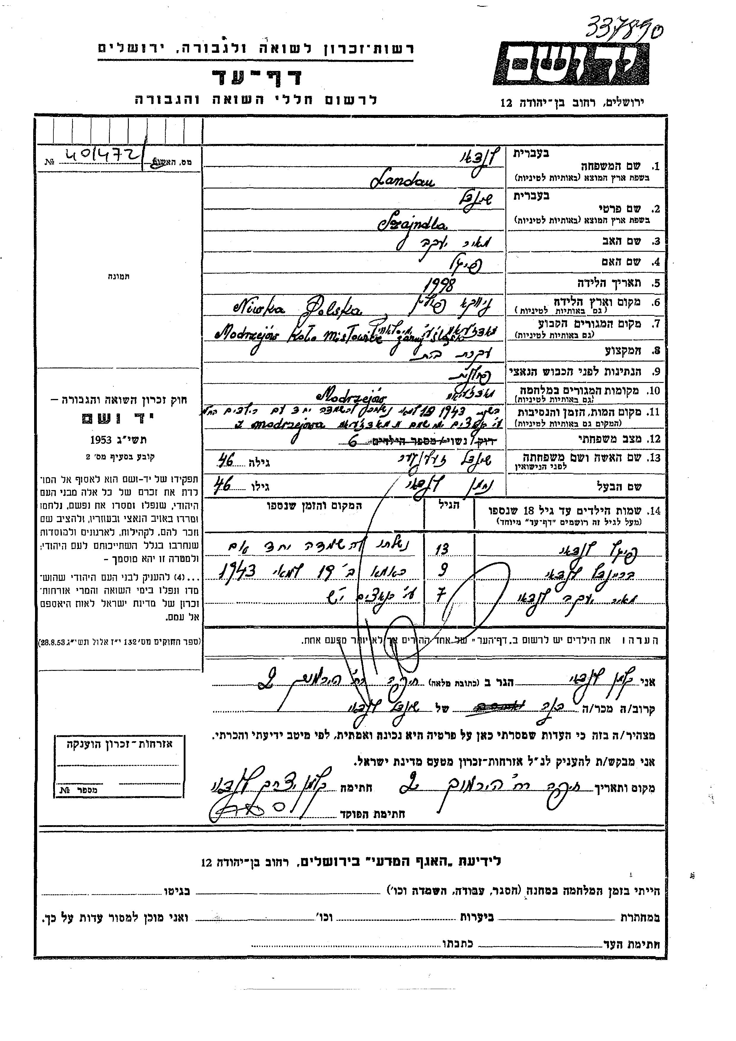 Szajndla Landau, geb. Zelinger wurde im Jahr 1898 in Niwka, Polen geboren. Sie war die Tochter von Meir Yaakov und Feigl. Sie war Hausfrau und mit Nakhman Verheiratet. Vor dem Zweiten Weltkrieg lebte sie in Modrzejow, Polen. Während des Krieges war sie in Modrzejow, Polen.