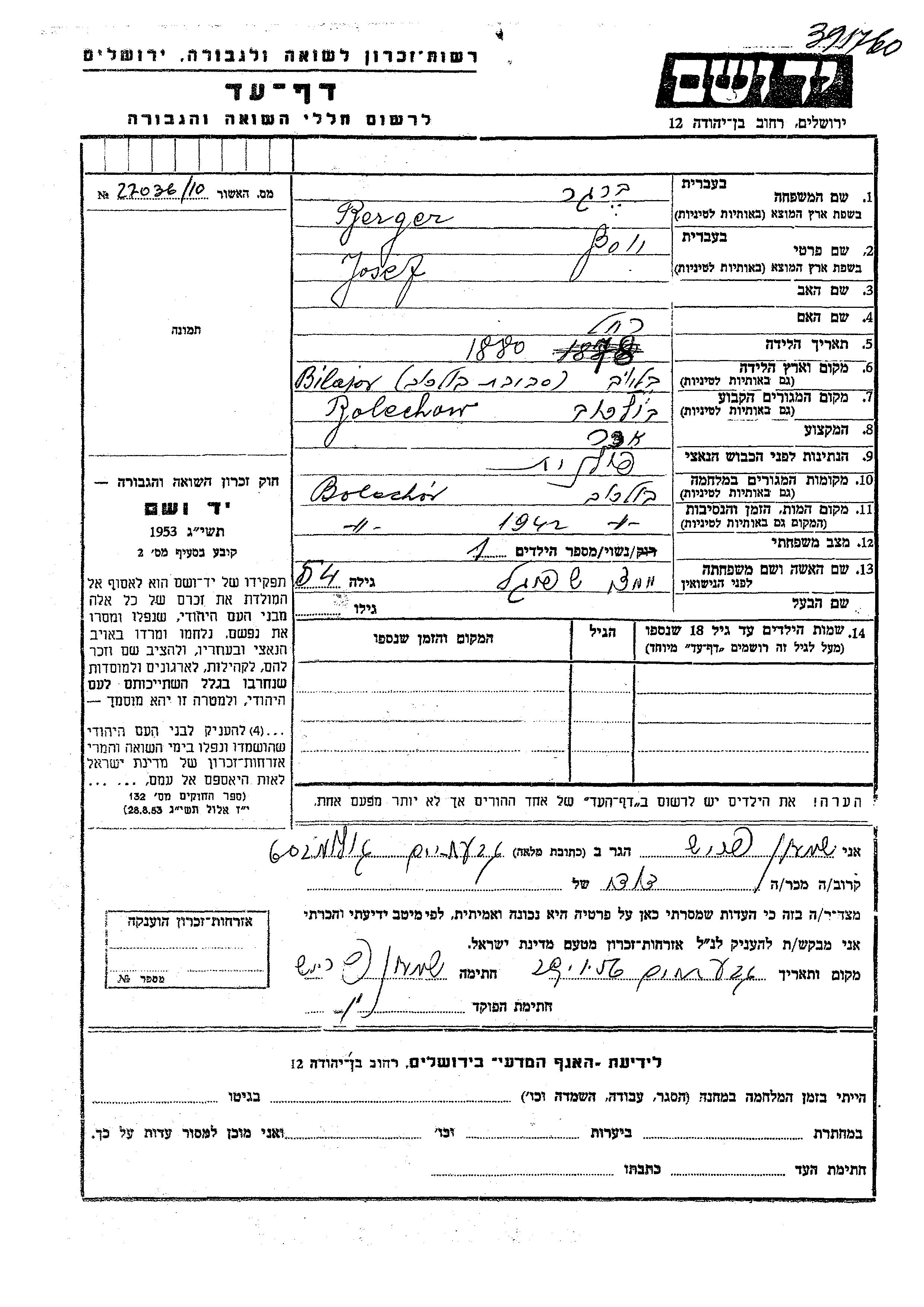 Josef Berger wurde im Jahr 1880 in Belejow, Polen geboren. Er war der Sohn von Rakhel. Er war Bauer/bäuerin und mit Mamela, geb. Shpigel Verheiratet. Vor dem Zweiten Weltkrieg lebte er in Bolechow, Polen. Während des Krieges war er in Bolechow, Polen.