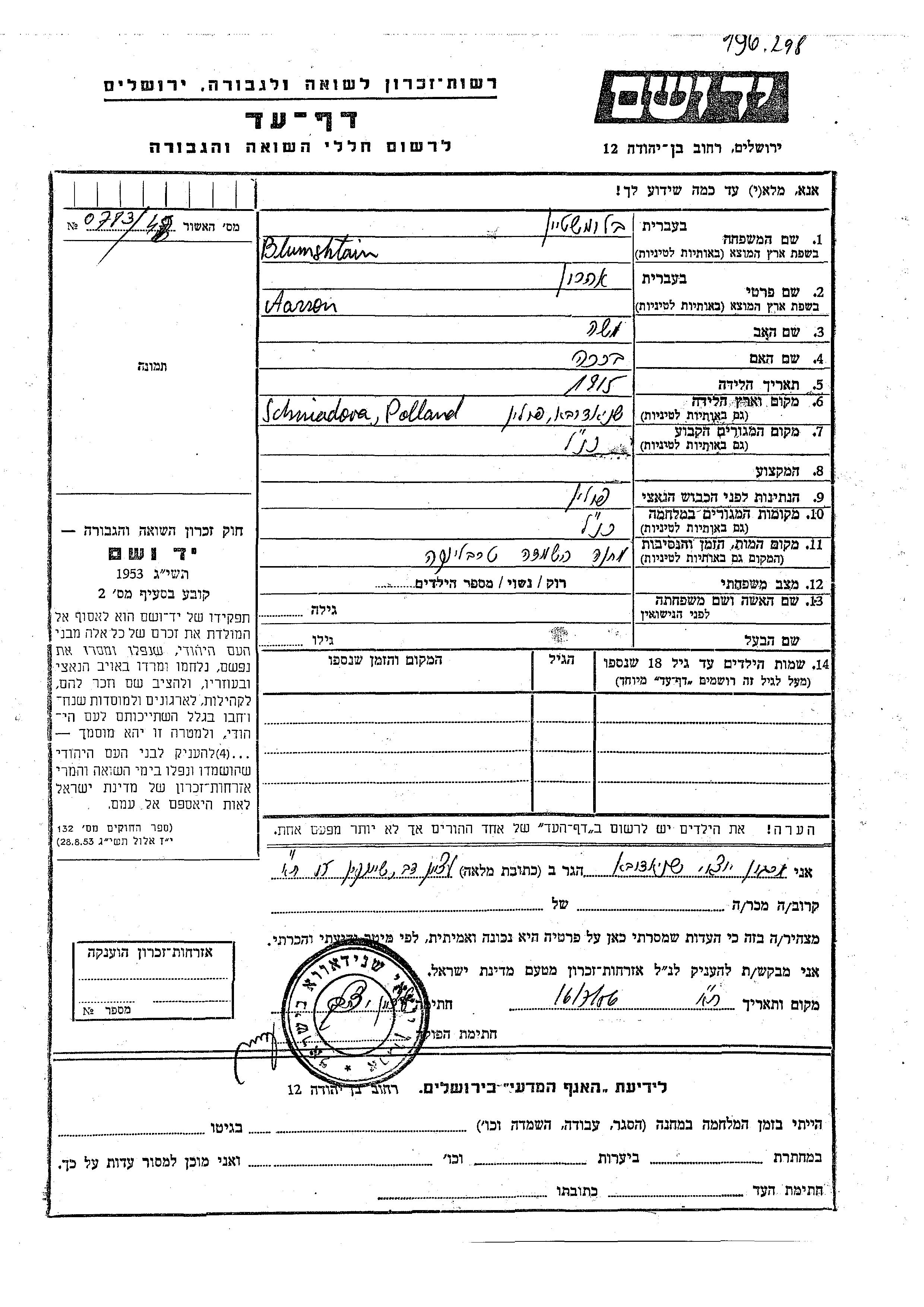 Aarron Blumshtain wurde im Jahr 1915 in Sniadowo, Polen geboren. Er war der Sohn von Moshe und Brakha. Vor dem Zweiten Weltkrieg lebte er in Sniadowo, Polen. Während des Krieges war er in Sniadowo, Polen.