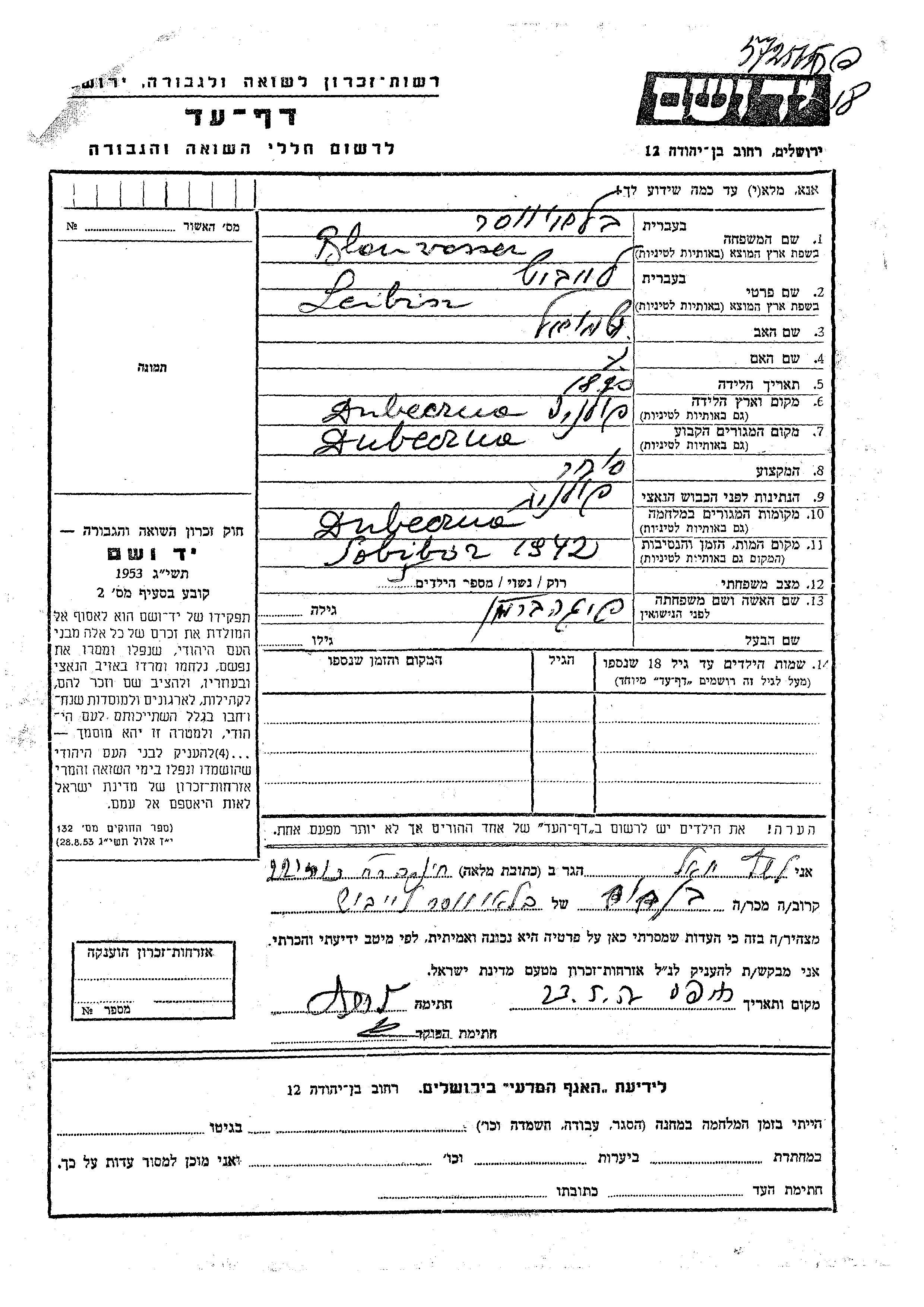 Leibisz Blauwasser wurde im Jahr 1890 in Dubeczno, Polen geboren. Er war der Sohn von Shmuel. Er war Kaufmann/-frau und mit Feiga, geb. Berman Verheiratet. Vor dem Zweiten Weltkrieg lebte er in Dubeczno, Polen. Während des Krieges war er in Dubeczno, Polen.