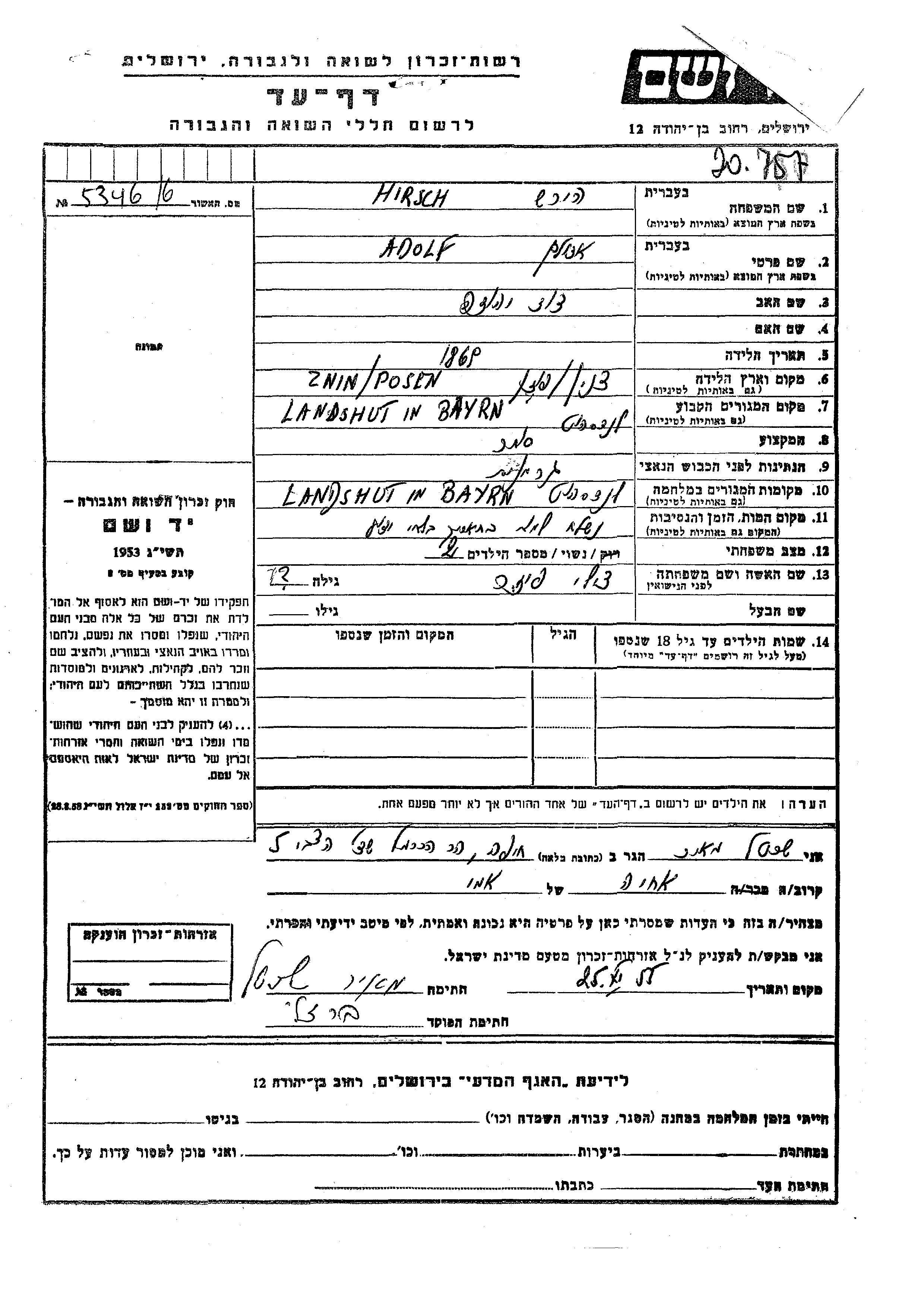 Adolf Hirsch wurde im Jahr 1869 in Znin, Polen geboren. Er war der Sohn von David Yehuda. Er war Kaufmann/-frau und mit Tzili, geb. Peizer Verheiratet. Vor dem Zweiten Weltkrieg lebte er in Landshut, Deutsches Reich. Während des Krieges war er in Landshut, Deutsches Reich.