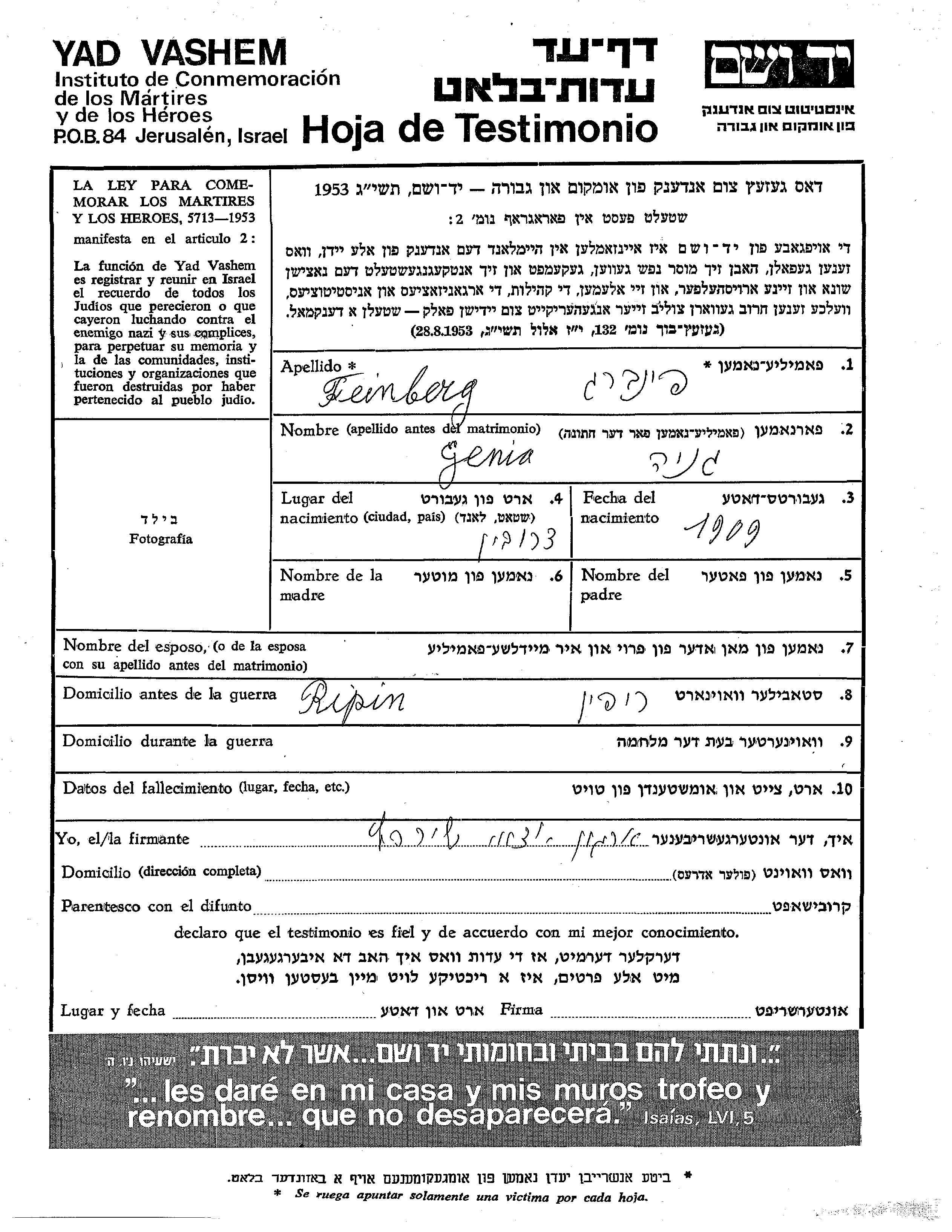 Genia Feinberg wurde im Jahr 1909 in Drobin, Polen geboren. Vor dem Zweiten Weltkrieg lebte sie in Ripin, Polen.