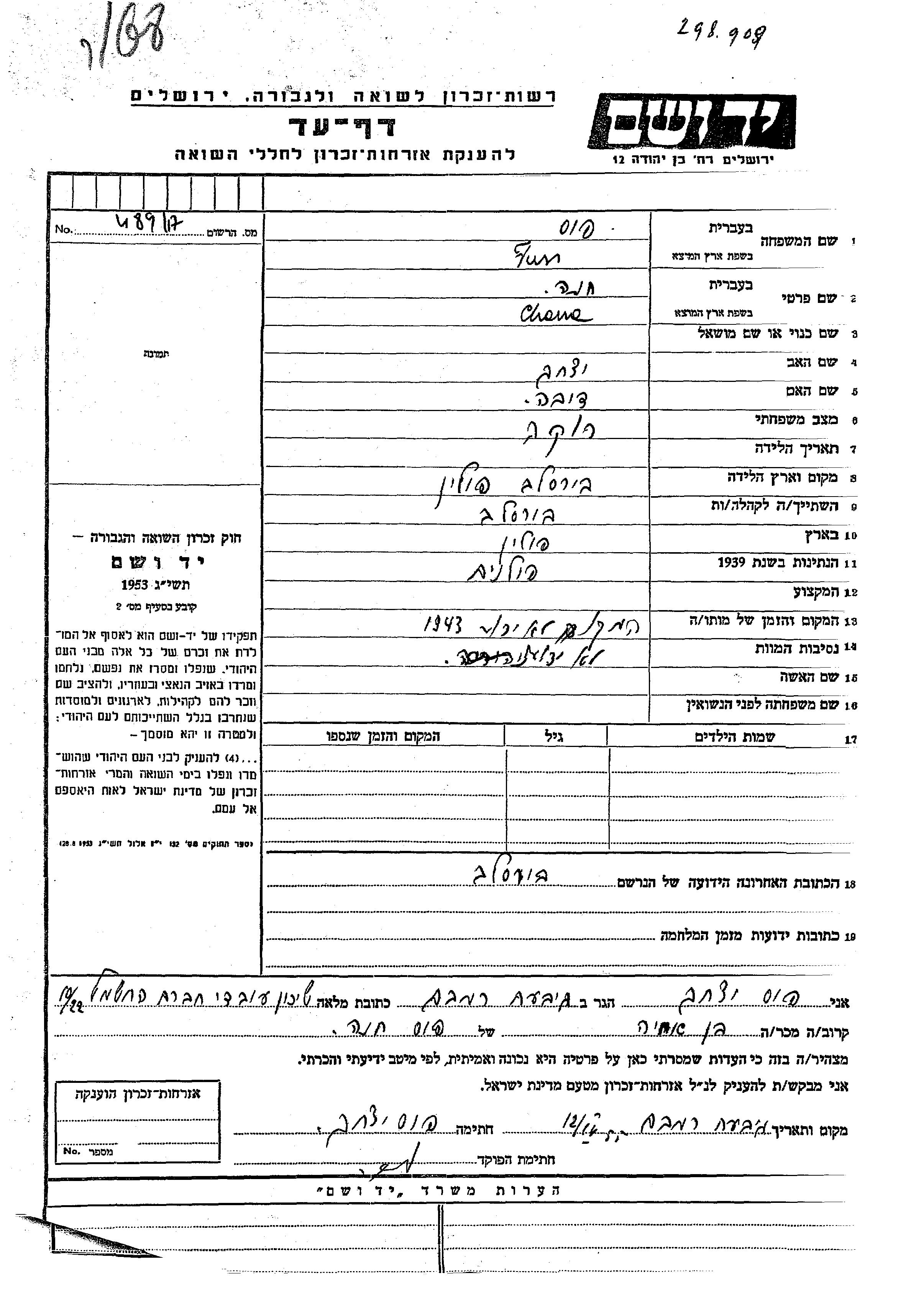 Chana wurde in der Schoah ermordet. Todesort: unbekannt im Jahr 1943.