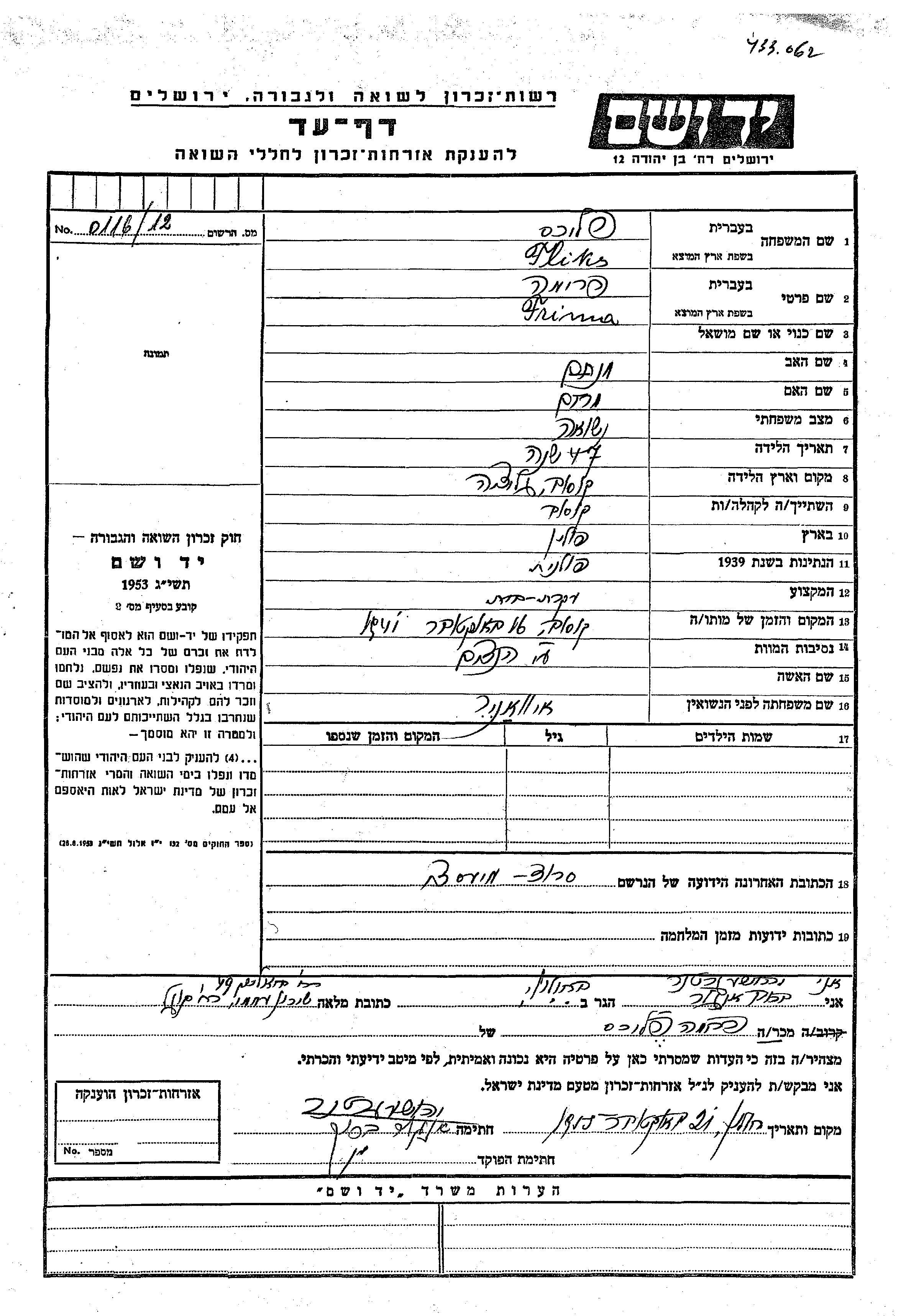 Frima wurde in der Schoah ermordet. Todesort: Kosow Pokucki, Polen im Jahr 16/10/1941.