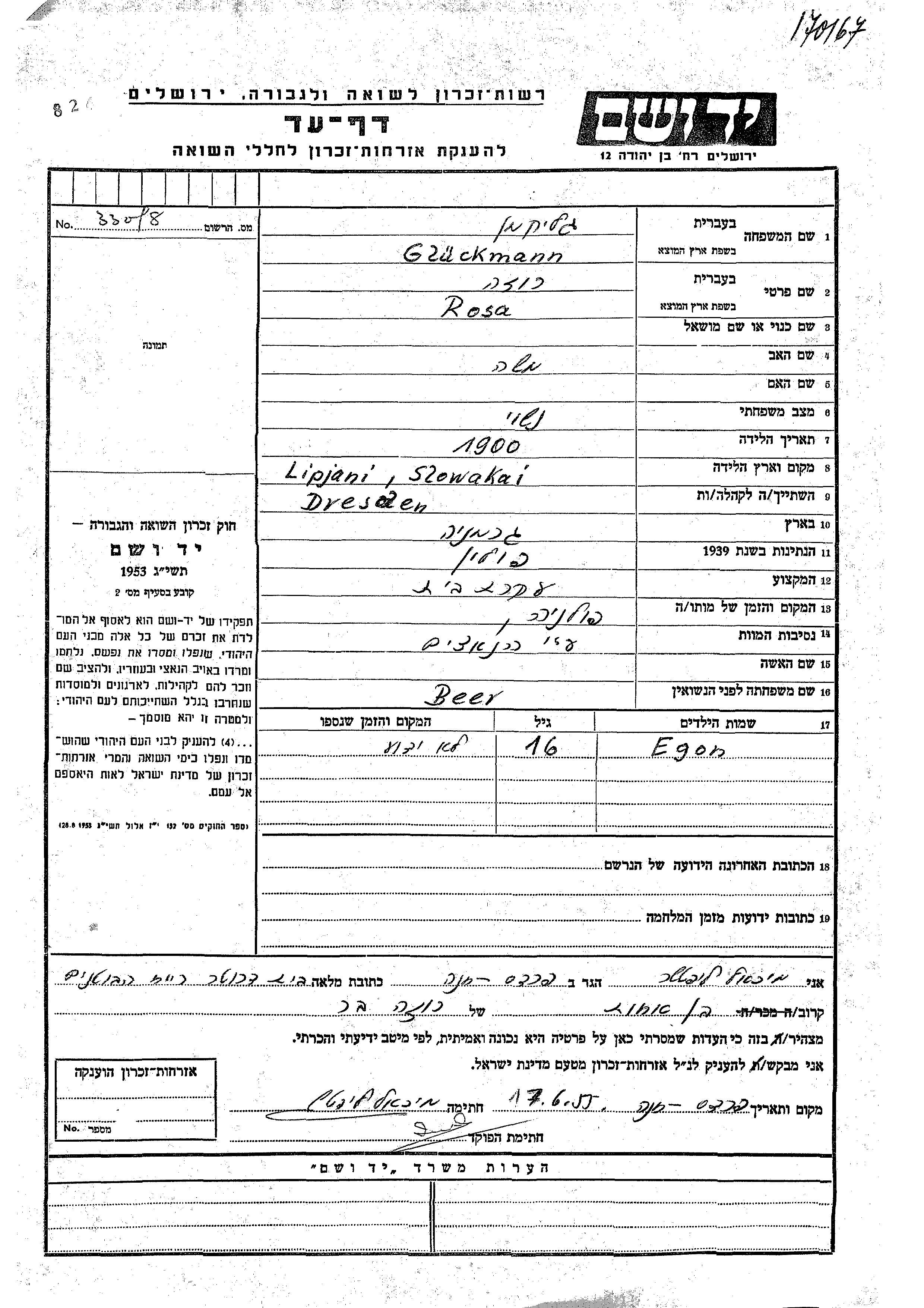 Rosa Gluckmann, geb. Beer wurde im Jahr 1900 in Lipiany, Tschechoslowakei geboren. Sie war die Tochter von Moshe. Sie war Hausfrau und Verheiratet.