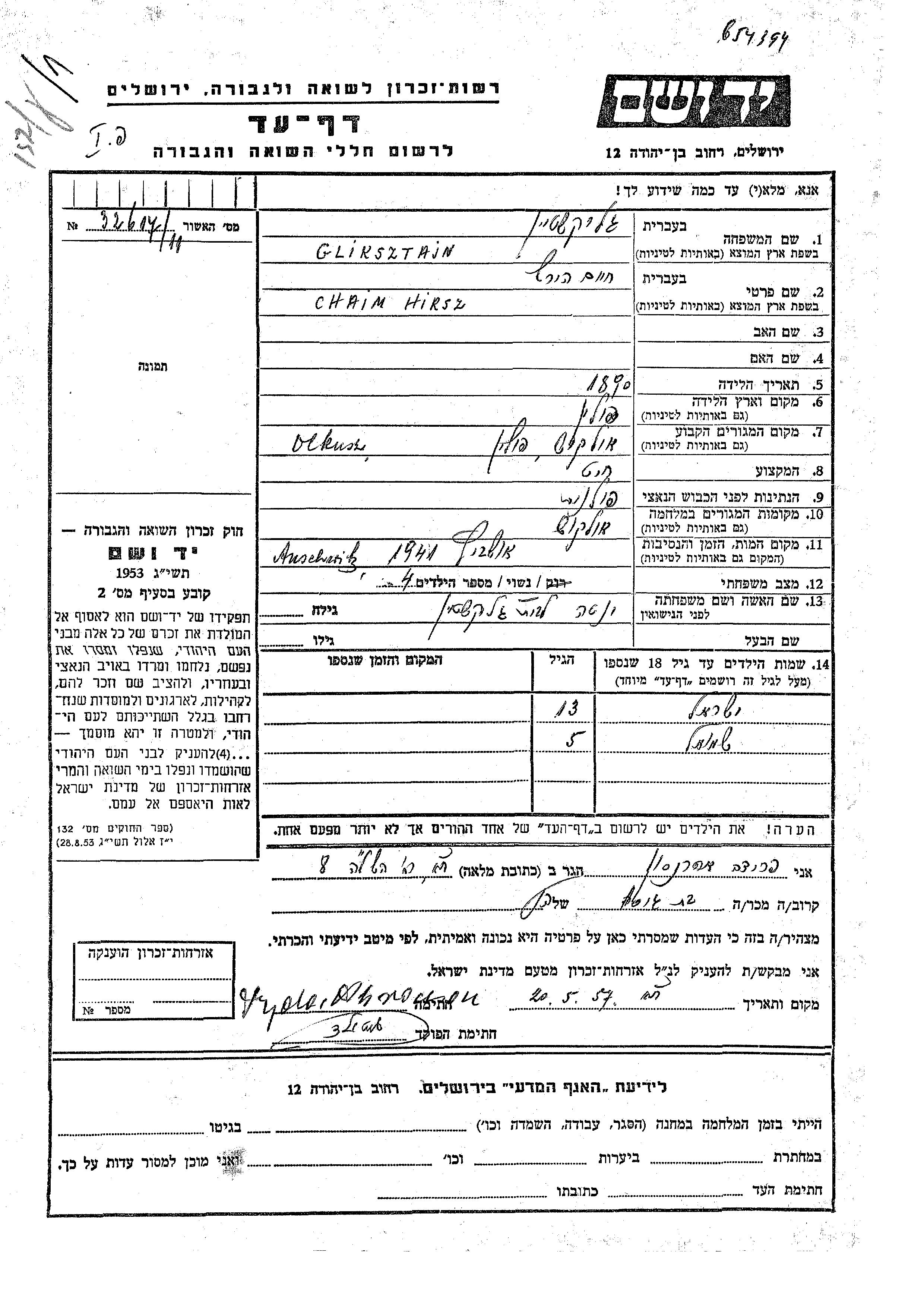 Chaim Hirsz wurde in der Schoah ermordet. Todesort: Auschwitz, Polen im Jahr 1941.