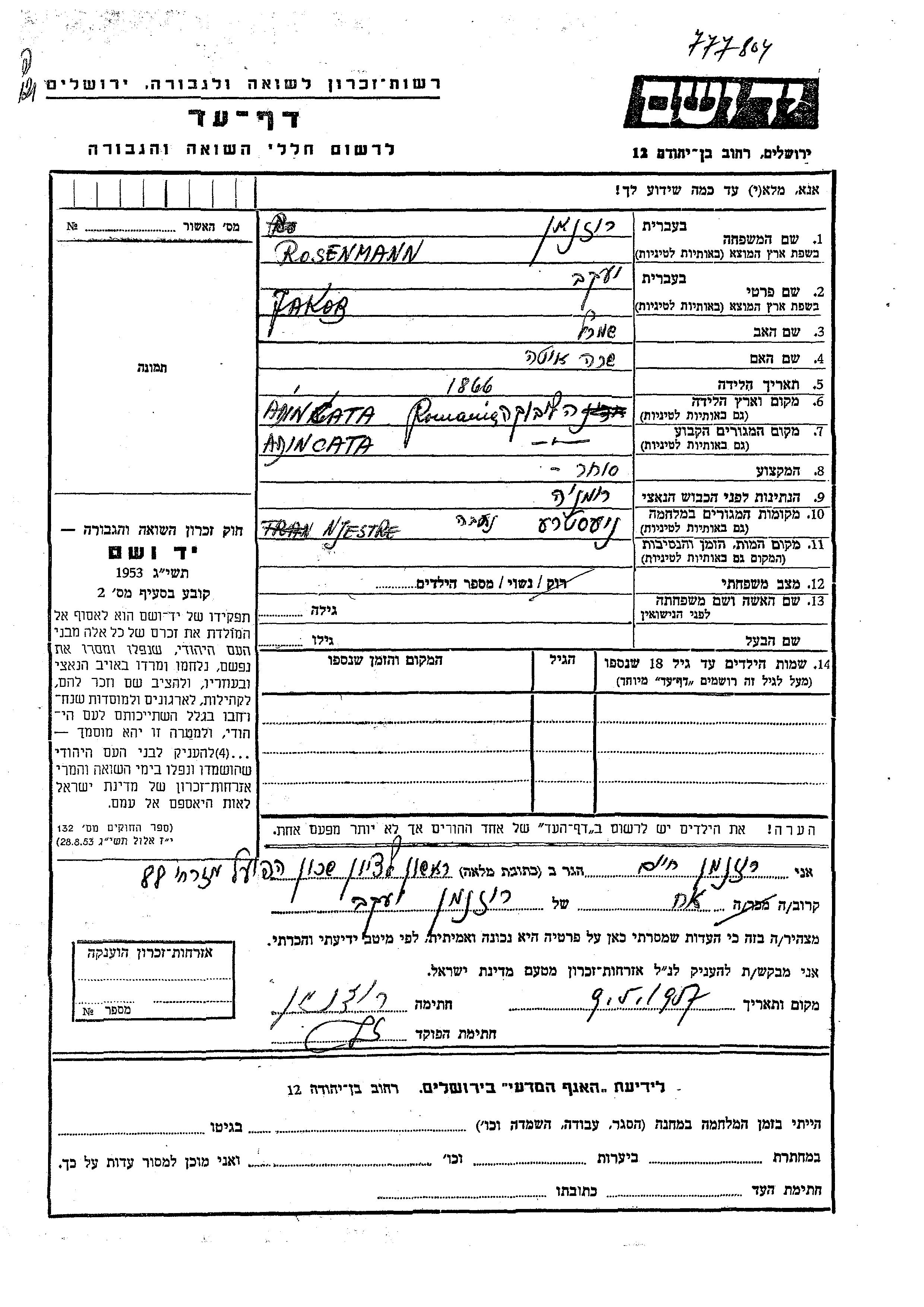 Yakob Rosenmann wurde im Jahr 1866 in Adincata, Rumänien geboren. Er war der Sohn von Shmul und Sara Ita. Er war Kaufmann/-frau und Verheiratet. Vor dem Zweiten Weltkrieg lebte er in Adincata, Rumänien.