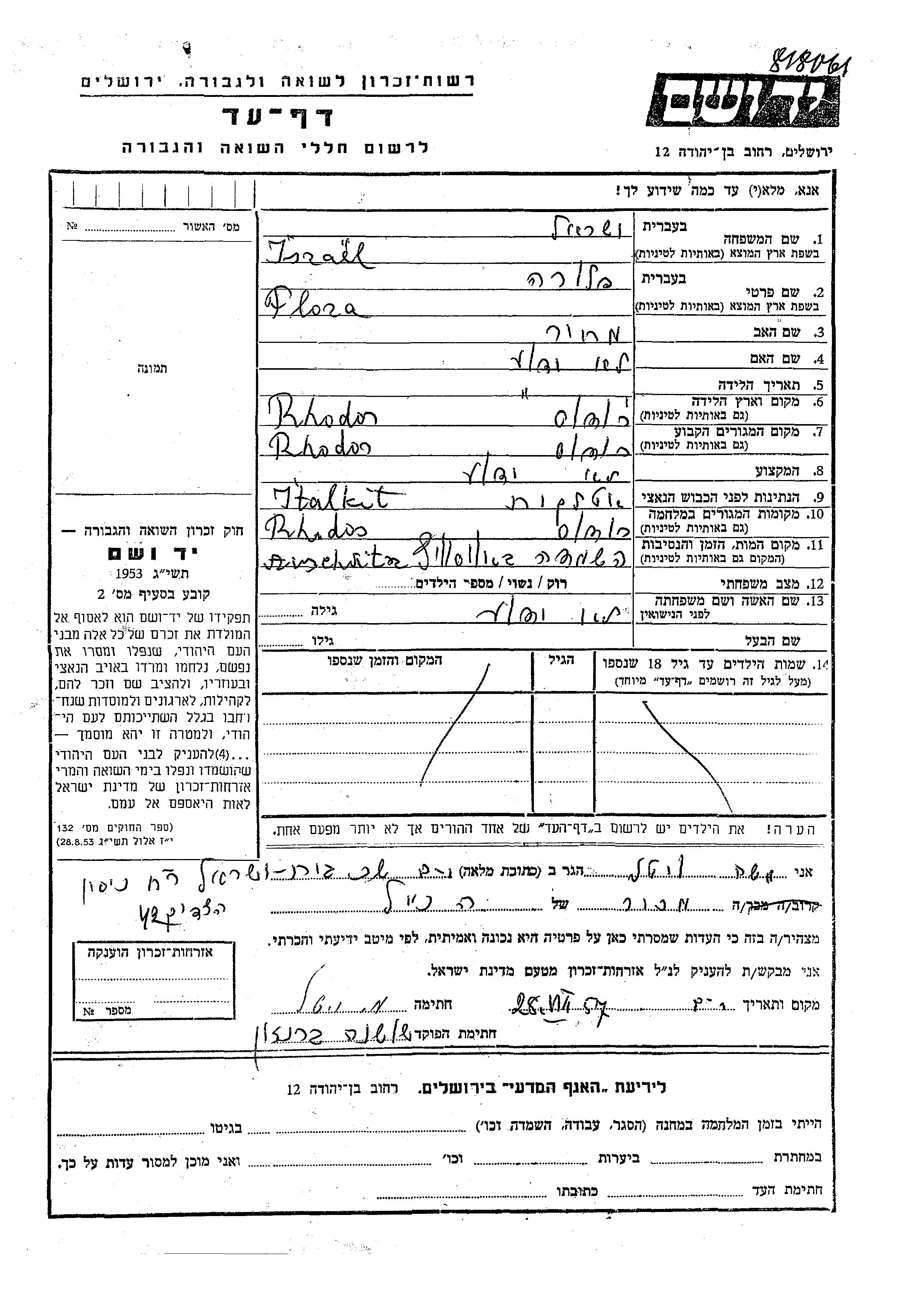 Flora Ysrael wurde in Rodi, Italien geboren. Sie war die Tochter von Makhir. Sie war Verheiratet. Vor dem Zweiten Weltkrieg lebte sie in Rodi, Italien. Während des Krieges war sie in Rodi, Italien.