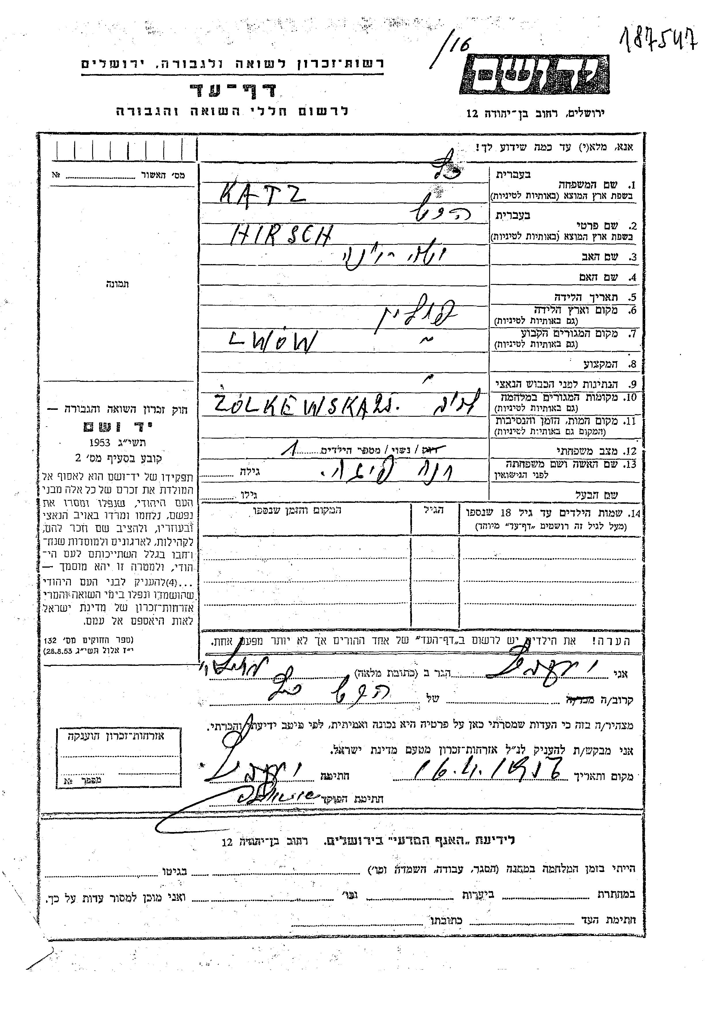Hirsch Katz wurde in Polen geboren. Er war der Sohn von Vina und Yeta. Er war mit Khana Feiga Verheiratet. Vor dem Zweiten Weltkrieg lebte er in Lwow, Polen. Während des Krieges war er in Lwow, Polen.