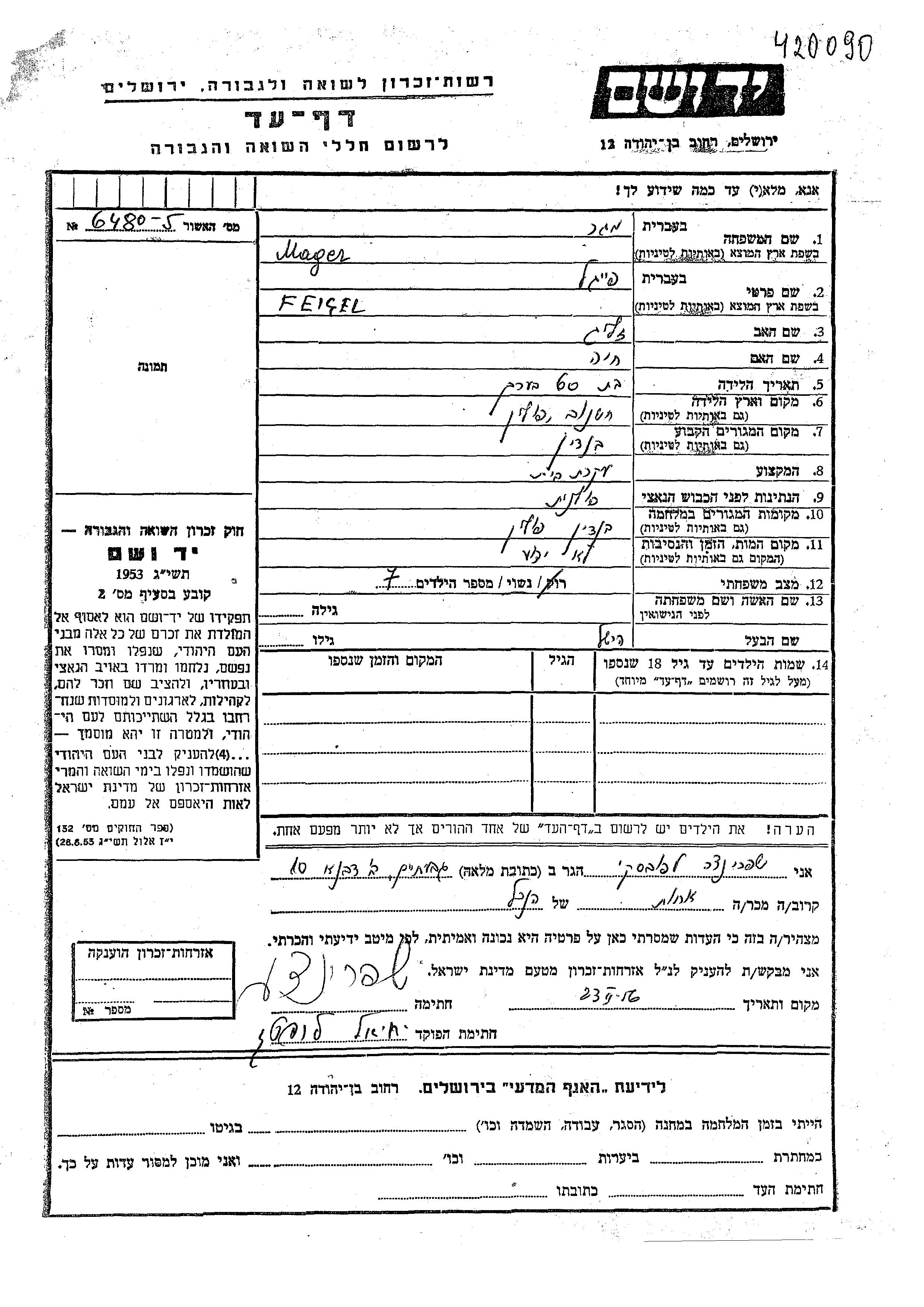 Feigel Mager wurde in Chrzanow, Polen geboren. Sie war die Tochter von Zelig und Khaia. Sie war Hausfrau und mit Fishel Verheiratet. Vor dem Zweiten Weltkrieg lebte sie in Bendzin, Polen. Während des Krieges war sie in Bendzin, Polen.
