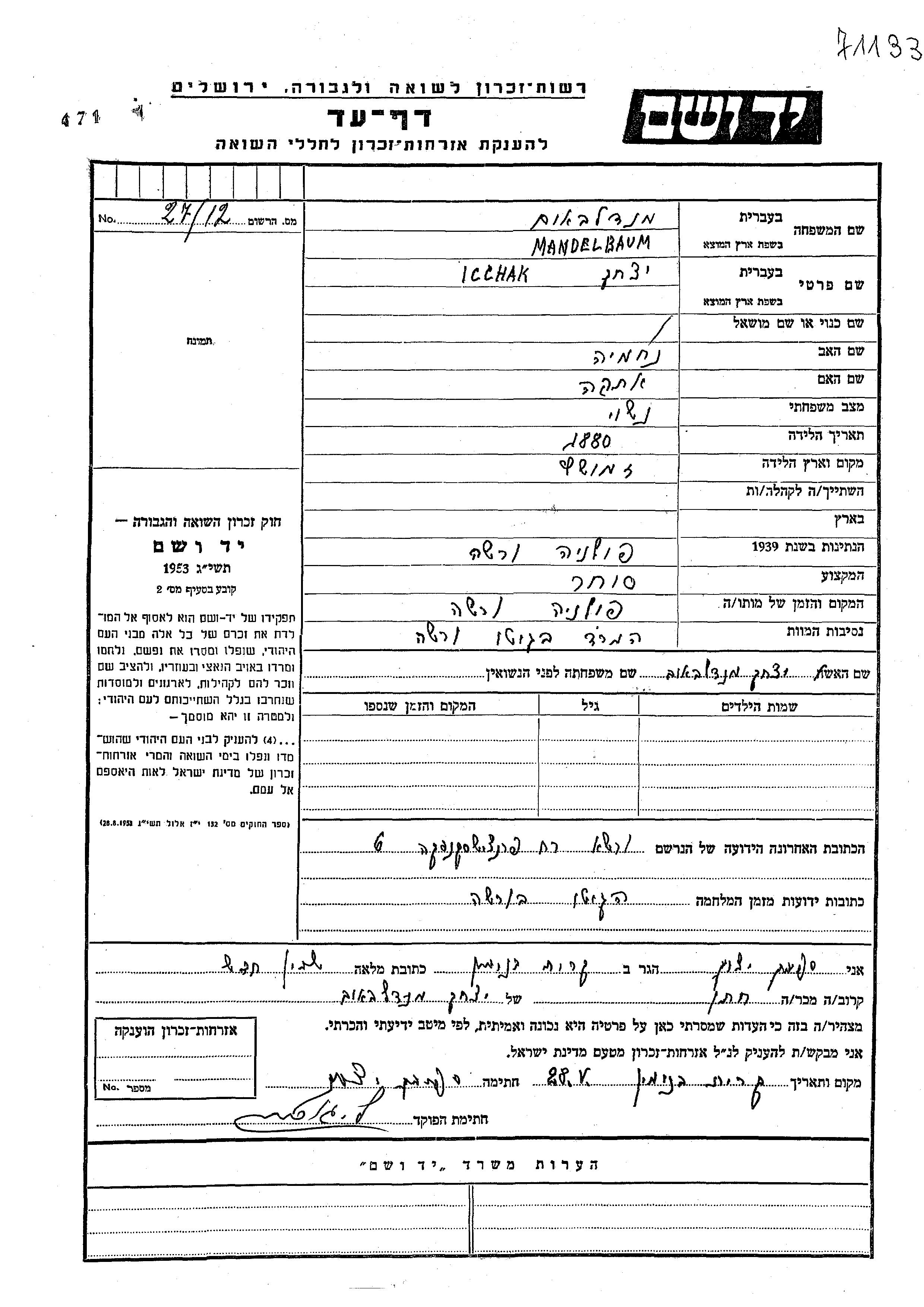 Icchak Mandelbaum wurde im Jahr 1880 in Zamosc, Polen geboren. Er war der Sohn von Nekhemia und Ester. Er war Kaufmann/-frau. Während des Krieges war er in Warsaw, Polen.