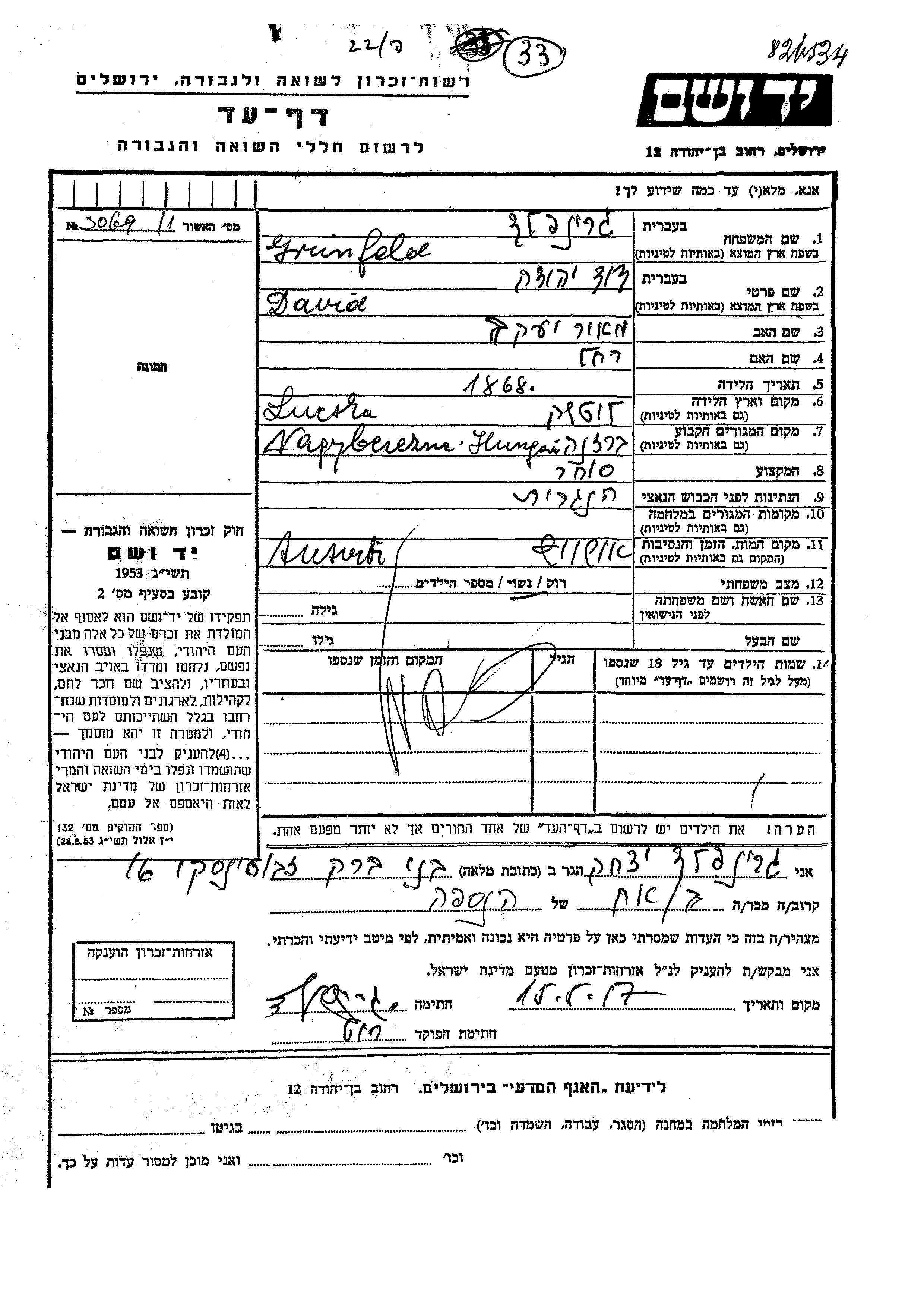 David Yehuda Grinfeld wurde im Jahr 1868 in Lucska, Tschechoslowakei geboren. Er war der Sohn von Meir Yaakov und Rakhel. Er war Kaufmann/-frau und Verheiratet. Vor dem Zweiten Weltkrieg lebte er in Nagyberezna, Tschechoslowakei.