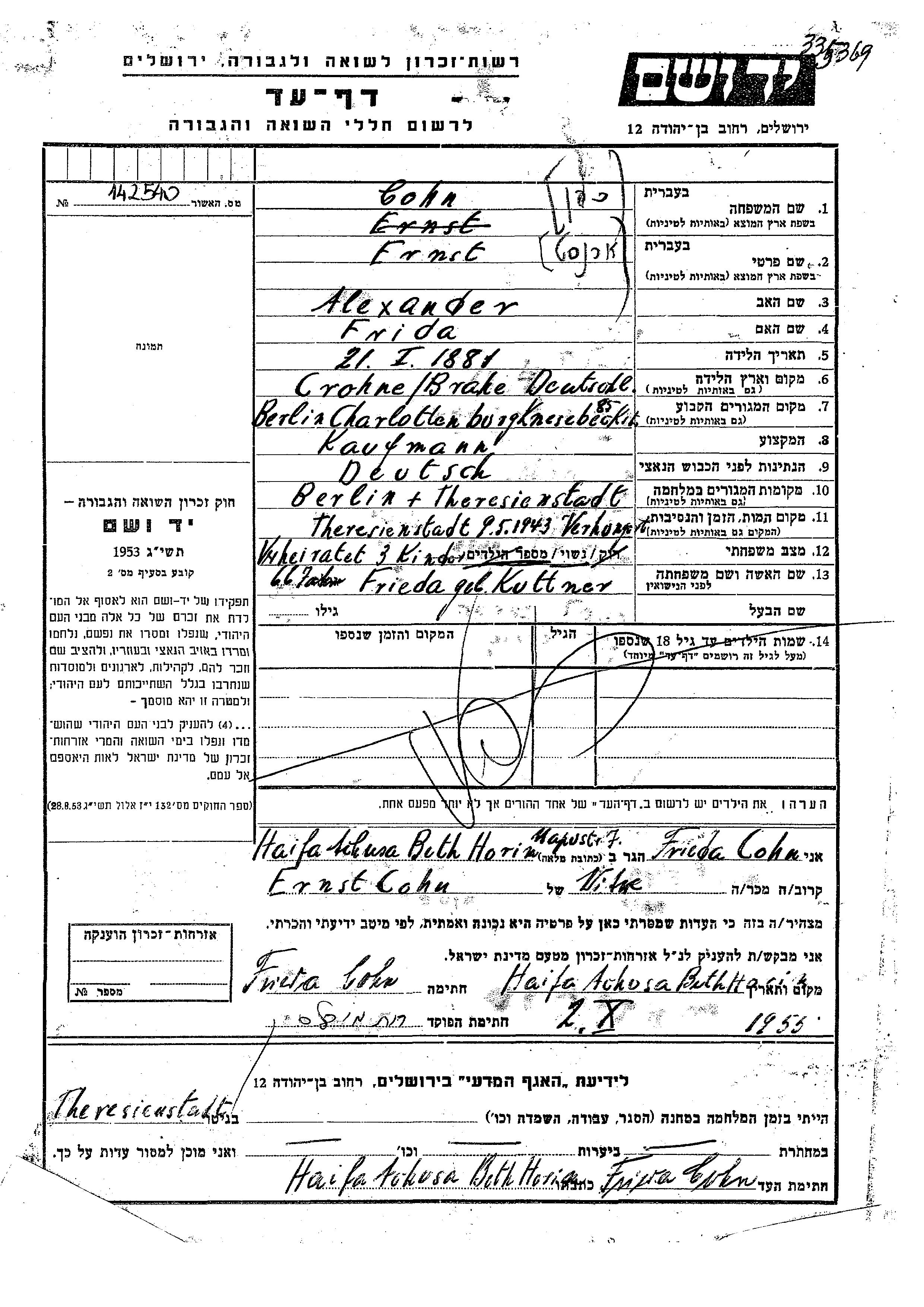 Ernst Cohn wurde im Jahr 1881 in Crohne Brahe, Polen geboren. Er war der Sohn von Alexander und Frida. Er war Kaufmann/-frau und mit Frieda Gel, geb. Kuttner Verheiratet. Vor dem Zweiten Weltkrieg lebte er in Berlin Charlottenburg, Deutsches Reich. Während des Krieges war er in Berlin, Deutsches Reich.