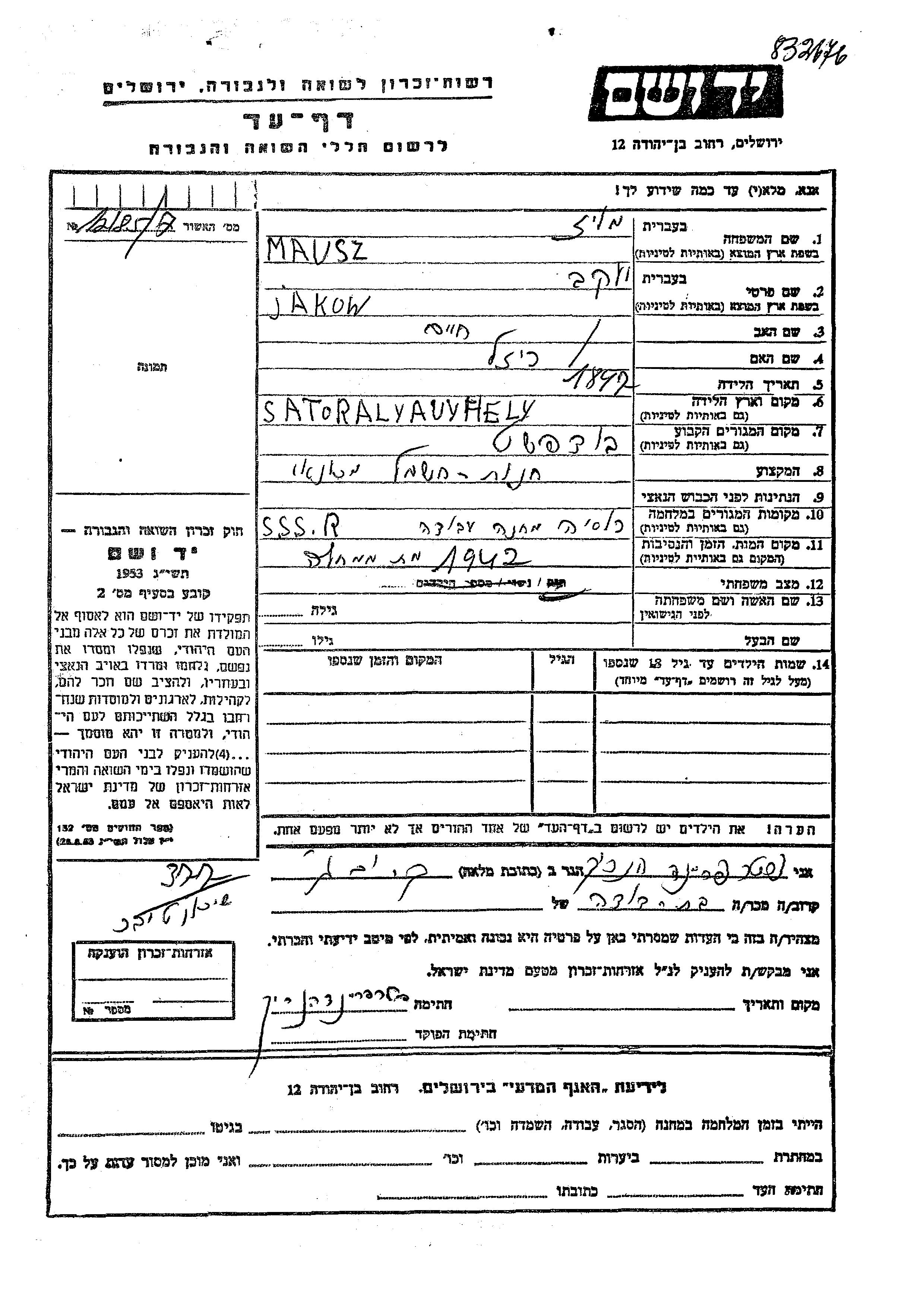 Jakow Mausz Moiz wurde im Jahr 1897 in Satoralya Ujhely, Ungarn geboren. Er war der Sohn von Khaim und Reizel. Er war Mechaniker/-in und Ledig. Vor dem Zweiten Weltkrieg lebte er in Budapest, Ungarn. Während des Krieges war er in Russland (UdSSR).