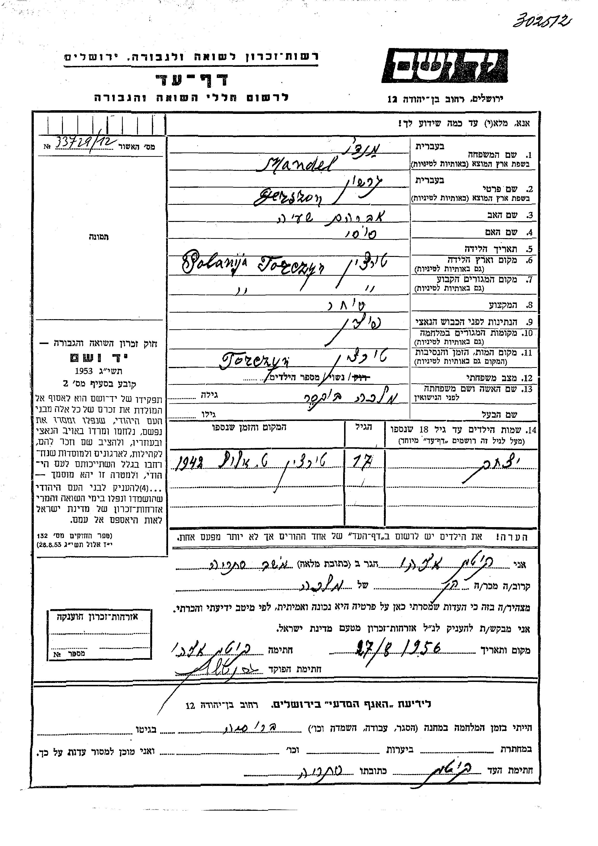 Gerszon Mandel wurde in Torczyn, Polen geboren. Er war der Sohn von Avraham Shaia und Pupi. Er war Kaufmann/-frau und mit Malka, geb. Bokser Verheiratet. Vor dem Zweiten Weltkrieg lebte er in Torczyn, Polen. Während des Krieges war er in Torczyn, Polen.