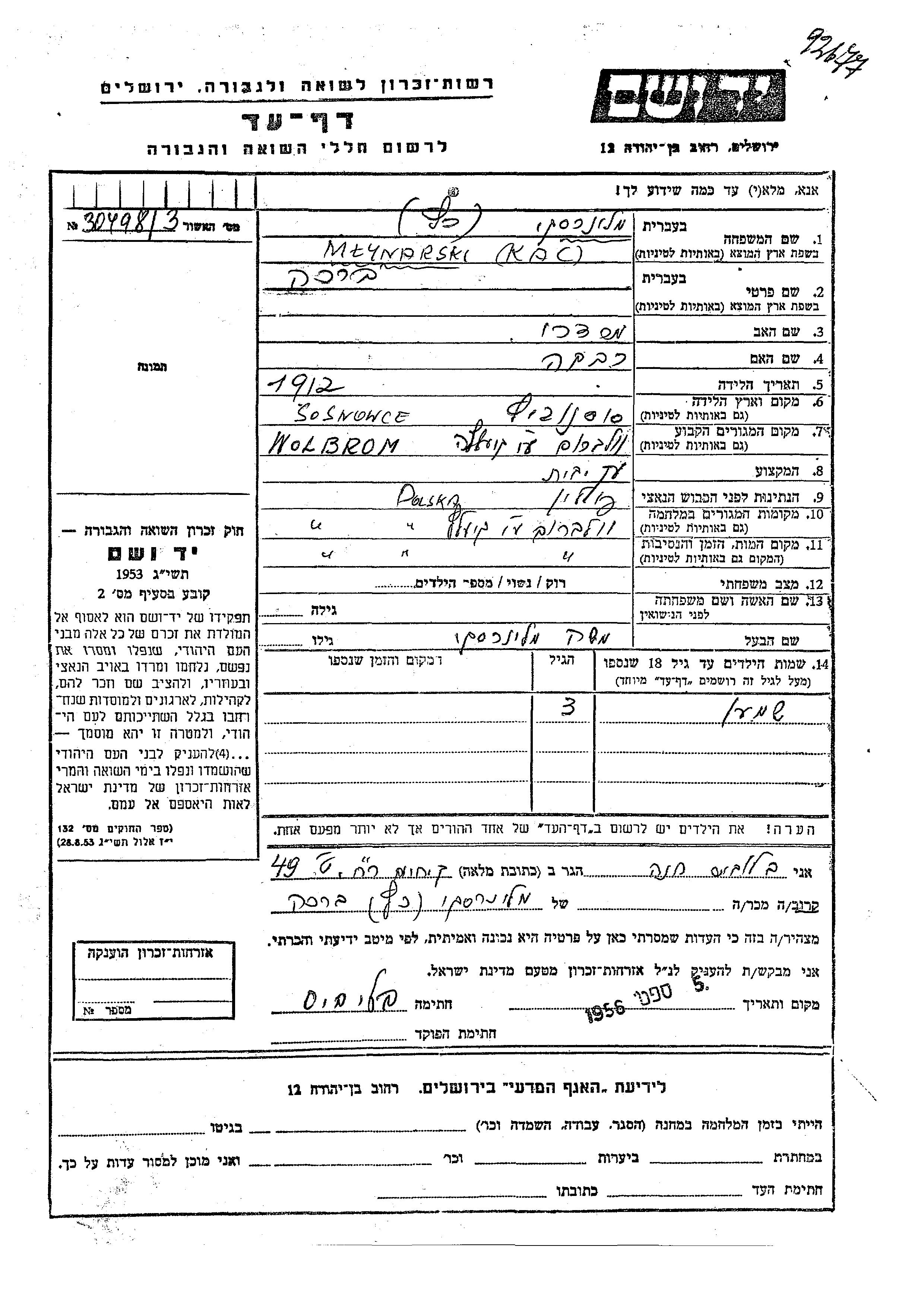 Brakha Młynarski, geb. Kac wurde im Jahr 1912 in Sosnovets, Polen geboren. Sie war die Tochter von Mordekhai und Rivka. Sie war Hausfrau und mit Moshe Verheiratet. Vor dem Zweiten Weltkrieg lebte sie in Wolbrom, Polen. Während des Krieges war sie in Wolbrom, Polen.