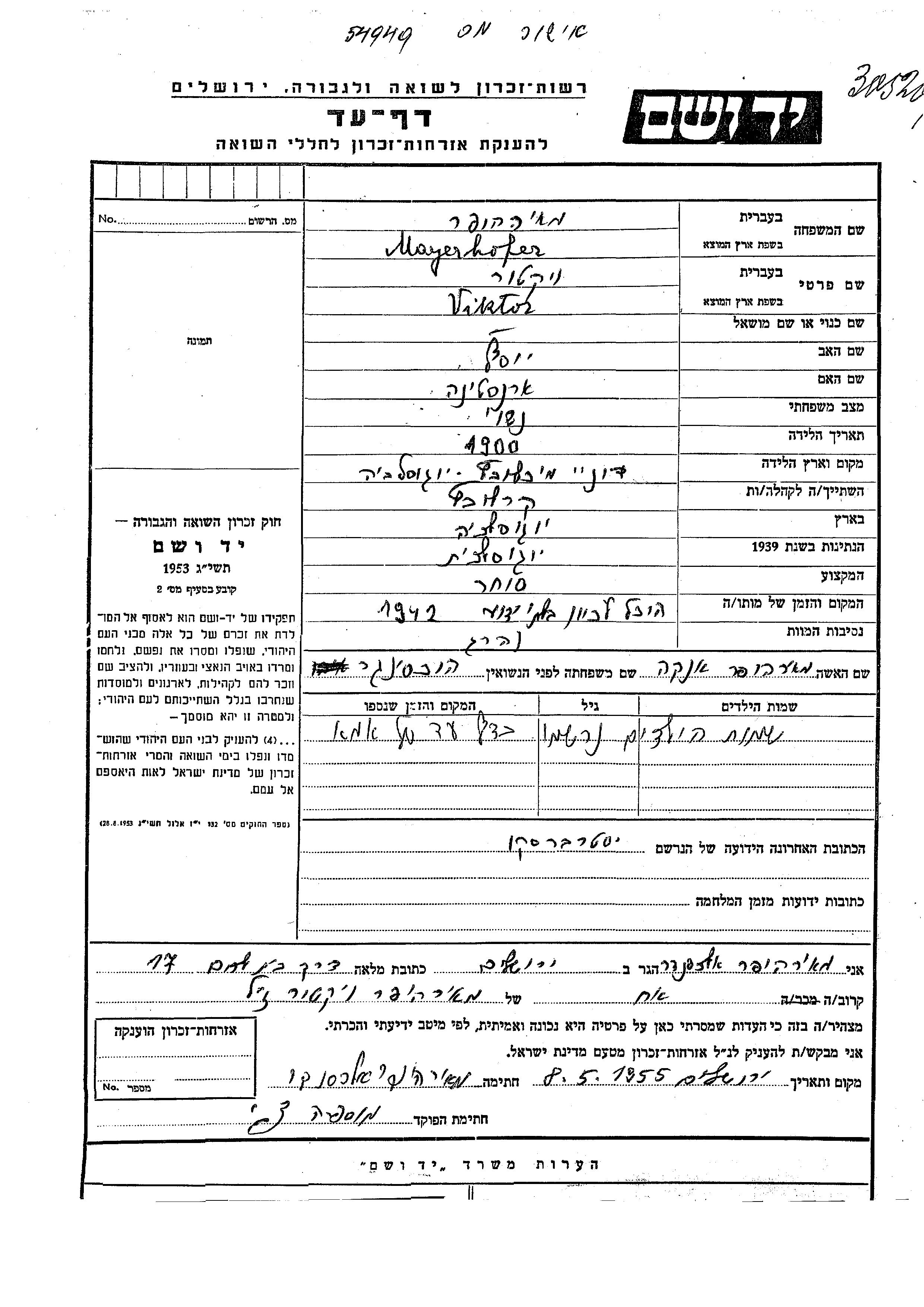 Viktor Mayerhofer wurde im Jahr 1900 in Donji Miholjac, Jugoslawien geboren. Er war der Sohn von Yosef und Ernestina. Er war Kaufmann/-frau und mit Anka, geb. Hokhzinger Verheiratet. Vor dem Zweiten Weltkrieg lebte er in Karlovac, Jugoslawien.