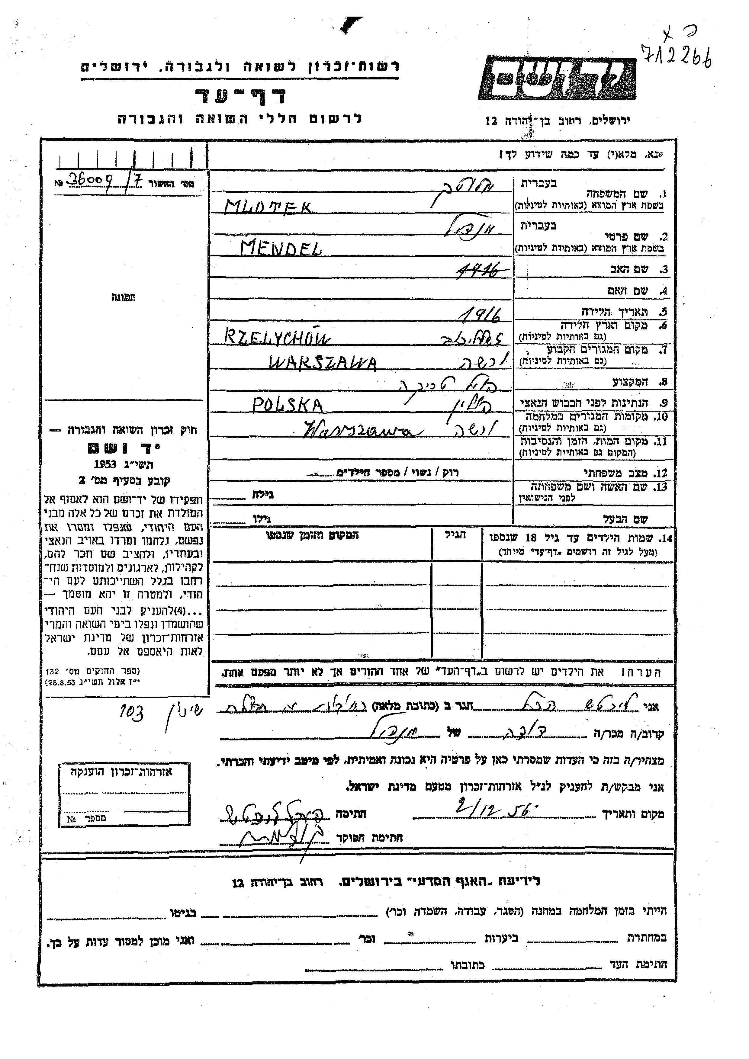 Mendel Mlotek wurde im Jahr 1916 in Zelechow, Polen geboren. Er war Arbeiter in einer trikotagenfabrik. Vor dem Zweiten Weltkrieg lebte er in Warsaw, Polen. Während des Krieges war er in Warsaw, Polen.