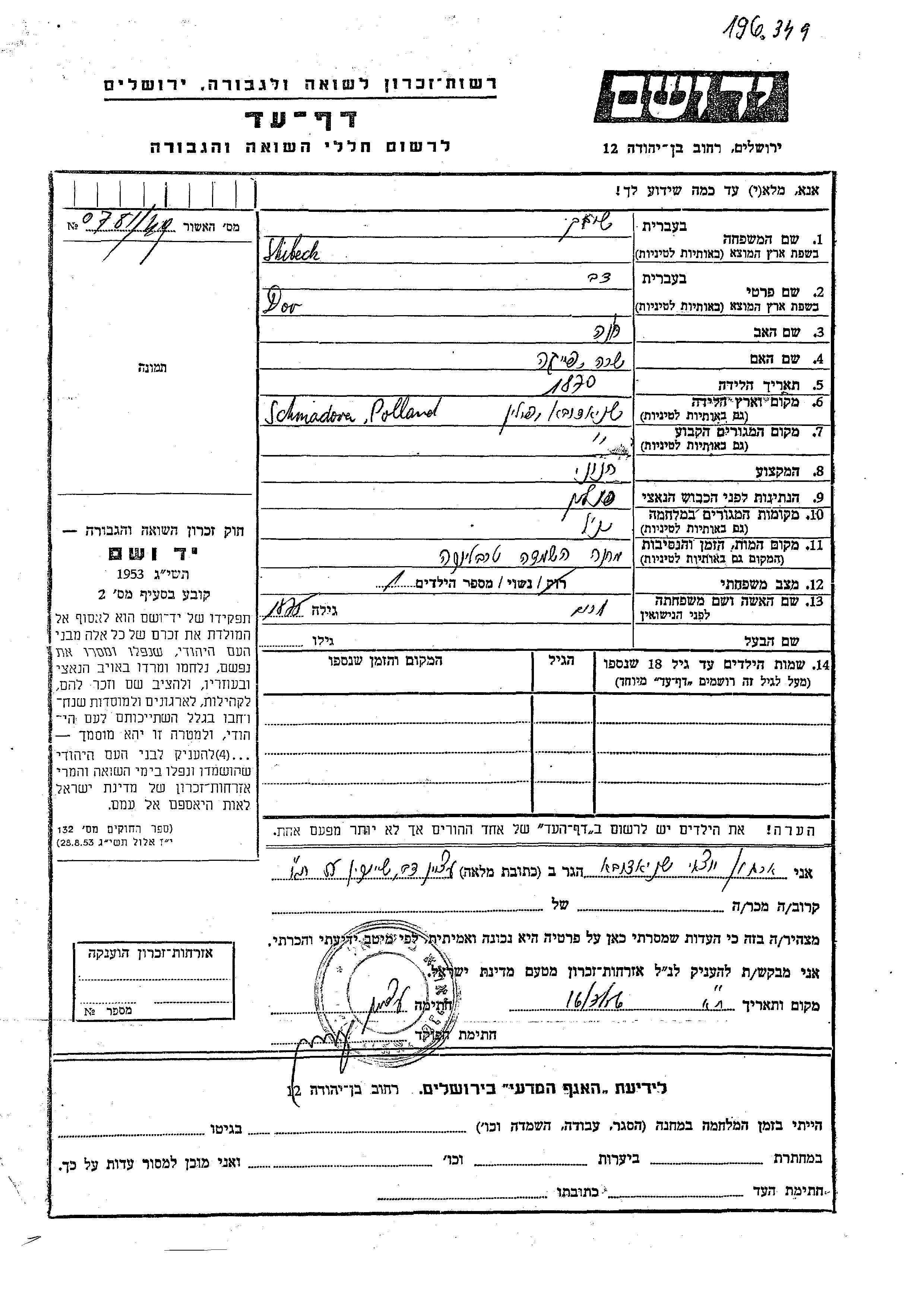 Dov Shibeck wurde im Jahr 1870 in Sniadow, Polen geboren. Er war der Sohn von Khona und Sara Feiga. Er war Lebensmittelhändler/-in und mit Miriam Verheiratet. Vor dem Zweiten Weltkrieg lebte er in Sniadow, Polen. Während des Krieges war er in Sniadow, Polen.