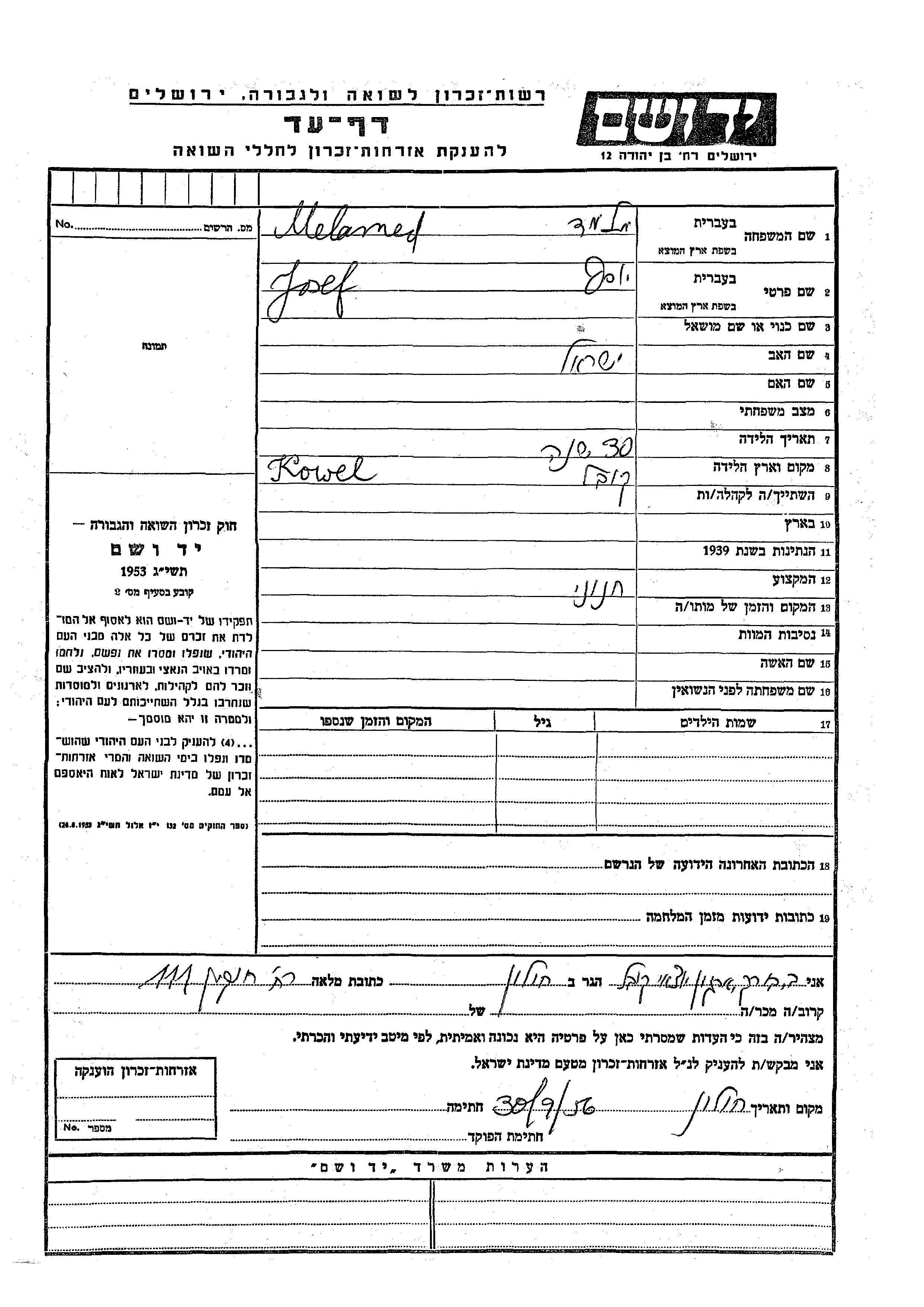 Josef Melamed wurde in Kowel, Polen geboren. Er war der Sohn von Yisrael. Er war Lebensmittelhändler/-in.