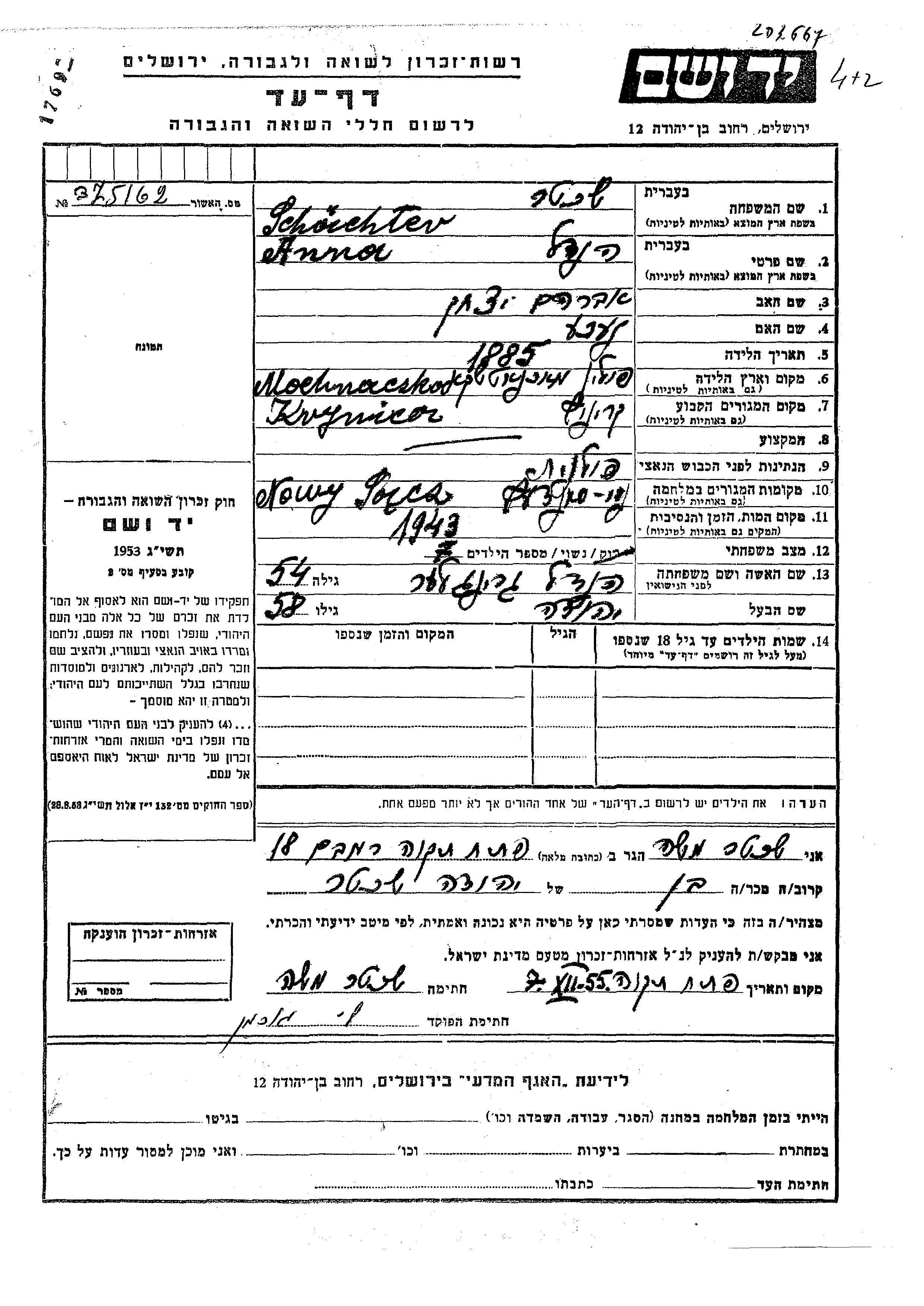 Anna Hendel Schächter, geb. Gringler wurde im Jahr 1885 in Mochnaczka, Polen geboren. Sie war die Tochter von Avraham Yitzkhak und Nekhe. Sie war mit Yehuda Verheiratet. Vor dem Zweiten Weltkrieg lebte sie in Krynica Zdroj, Polen. Während des Krieges war sie in Nowy Sacz, Polen.