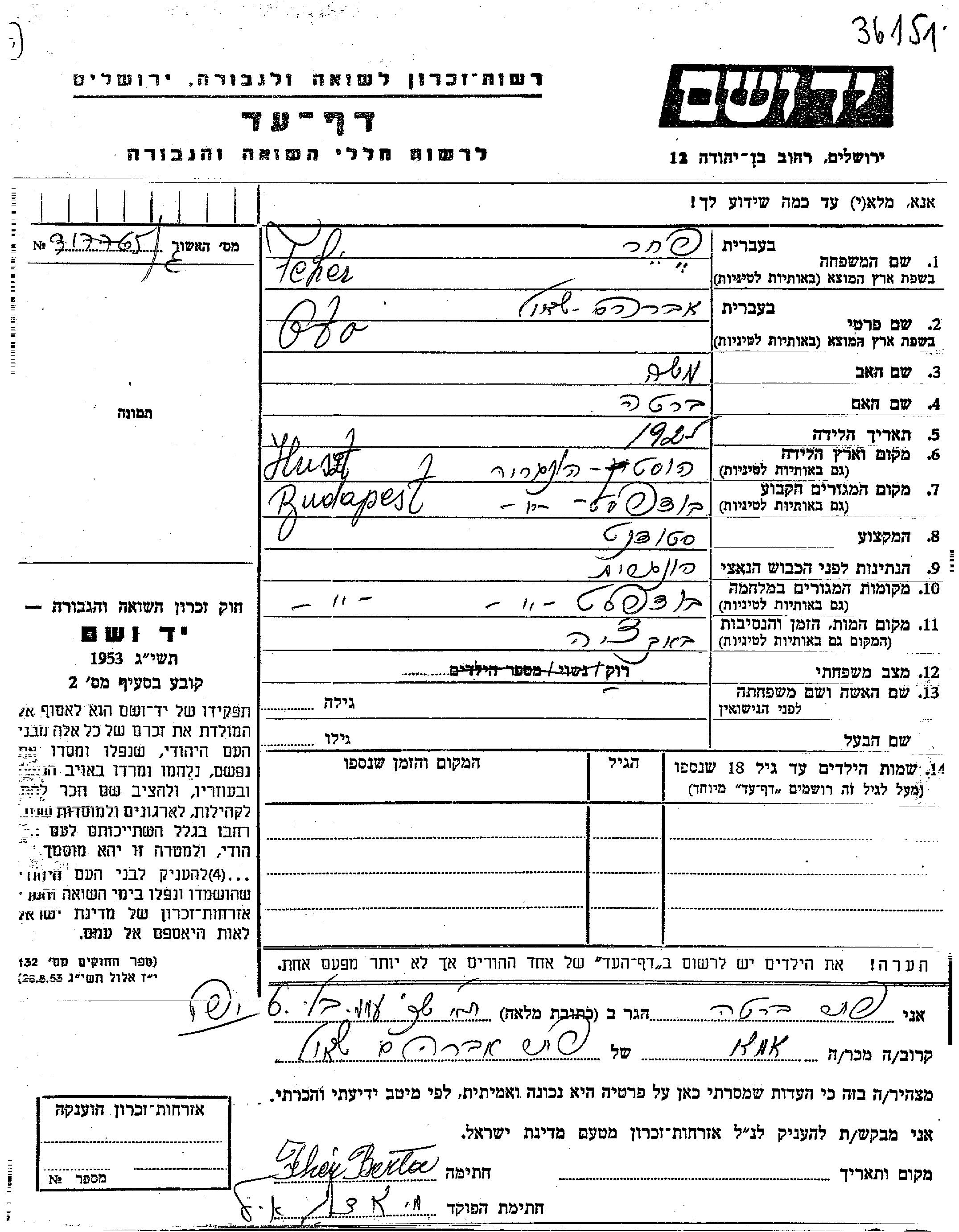 Oko Avraham Shaul Pekher Feher wurde im Jahr 1925 in Huszt, Tschechoslowakei geboren. Er war der Sohn von Moshe und Berta. Er war Student und Ledig. Vor dem Zweiten Weltkrieg lebte er in Budapest, Ungarn. Während des Krieges war er in Budapest, Ungarn.