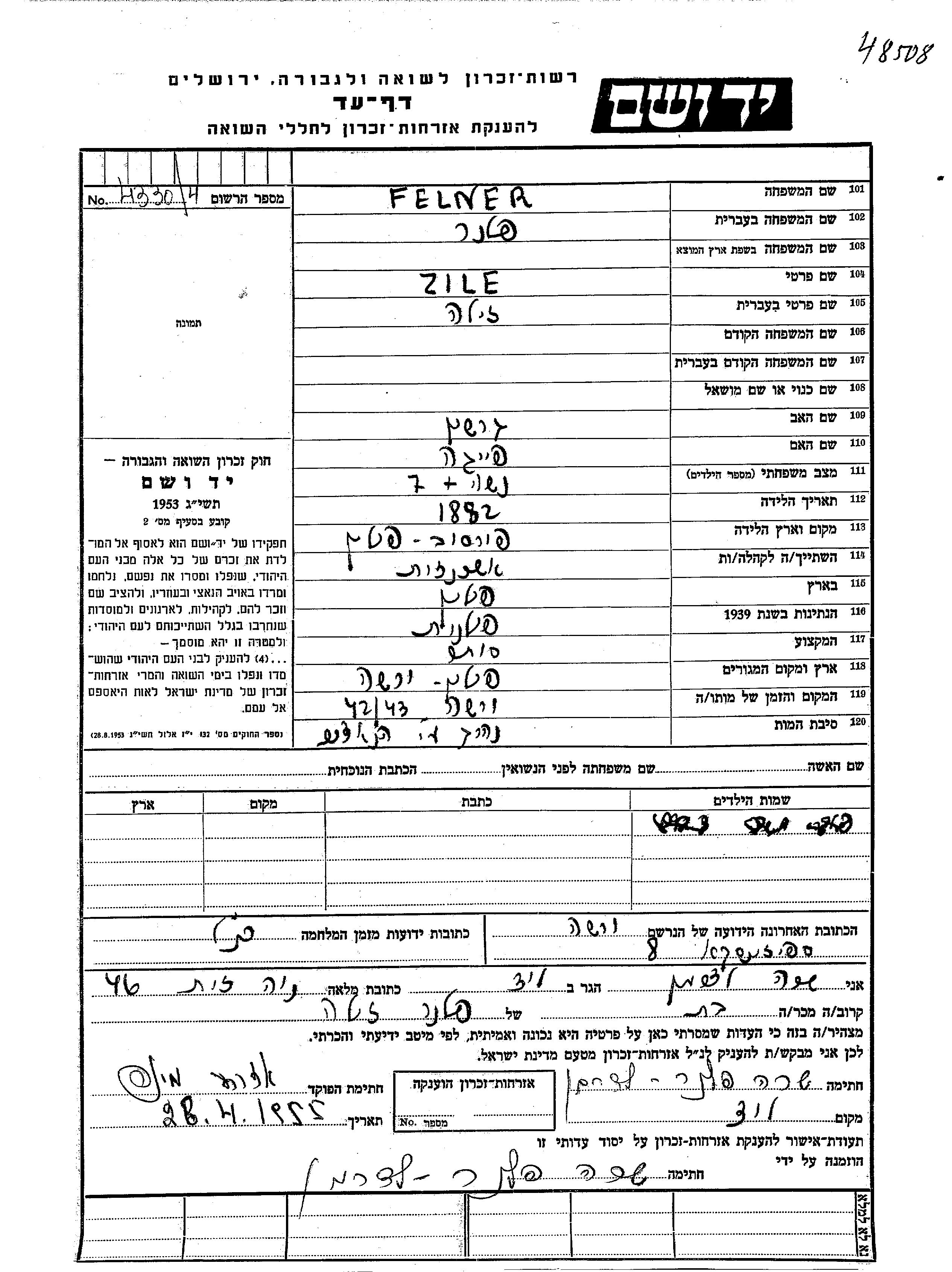 Zile Felner wurde im Jahr 1882 in Porszalok, Ungarn geboren. Er war der Sohn von Gershon und Feiga. Er war Kaufmann/-frau und Verheiratet. Vor dem Zweiten Weltkrieg lebte er in Warszawa, Polen. Während des Krieges war er in Warszawa, Polen.