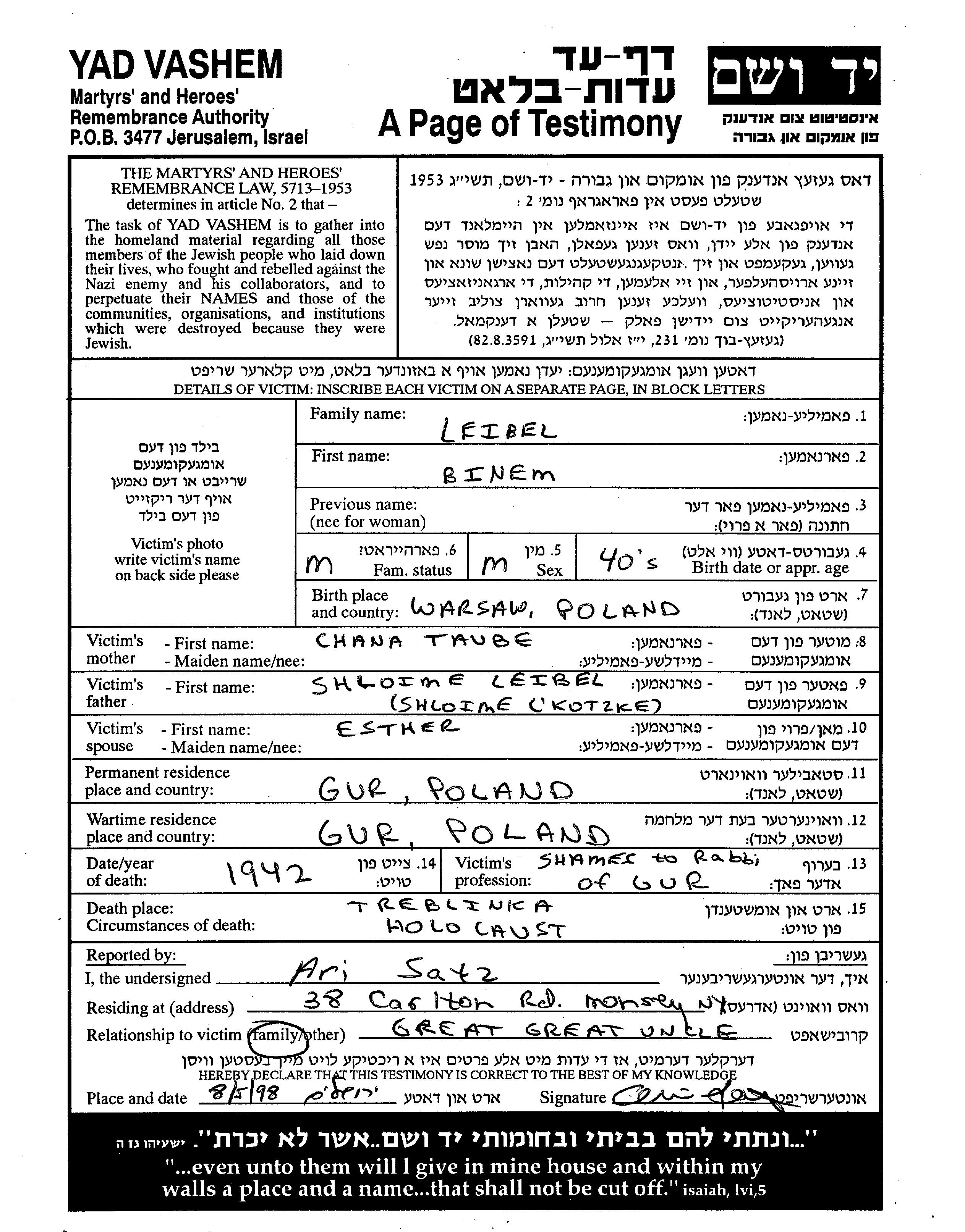 Binem Leibel wurde in Warsaw, Polen geboren. Er war der Sohn von Shloime und Chana Tauba. Er war Religious functionary und mit Esther Verheiratet. Vor dem Zweiten Weltkrieg lebte er in Gora Kalwaria, Polen. Während des Krieges war er in Gora Kalwaria, Polen.