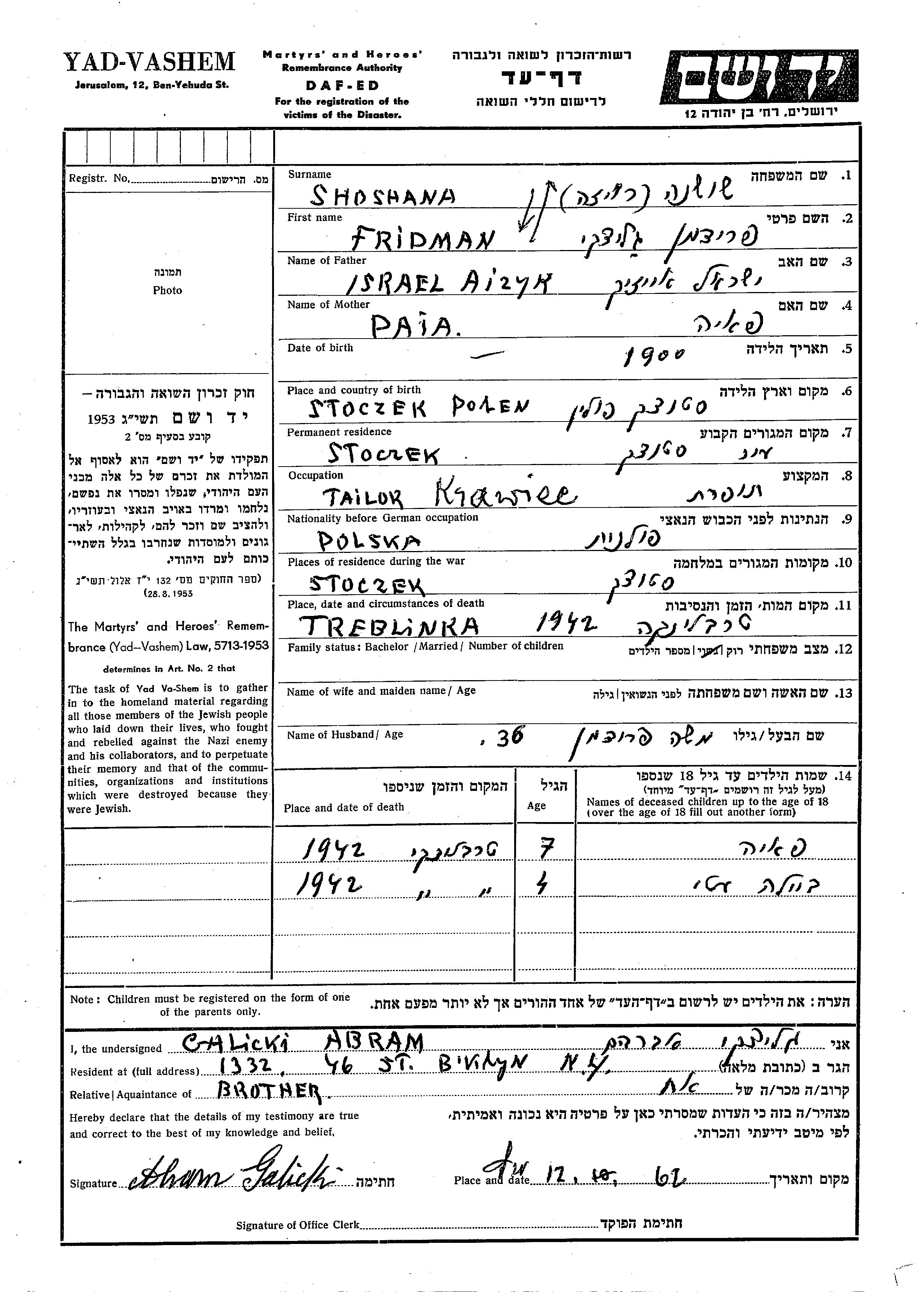 Shoshana Roiza Fridman Galitzki wurde im Jahr 1900 in Stoczek, Polen geboren. Sie war die Tochter von Israel Aizyk und Paia. Sie war Schneiderin und mit Moshe Verheiratet. Vor dem Zweiten Weltkrieg lebte sie in Stoczek, Polen. Während des Krieges war sie in Stoczek, Polen.