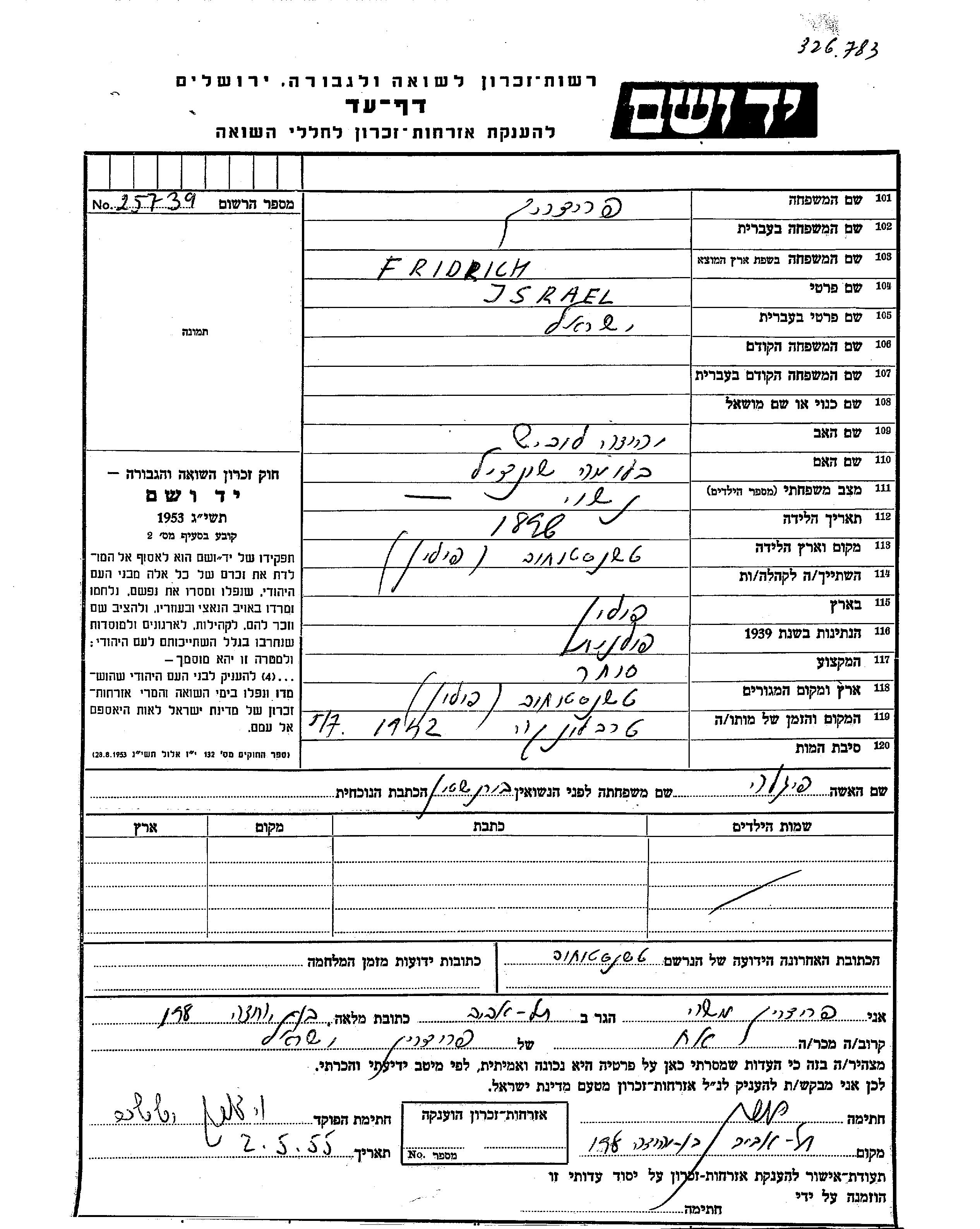 Israel Fridrich wurde im Jahr 1896 in Czenstochowa, Polen geboren. Er war der Sohn von Yehuda Luvish und Bluma Sheina. Er war Kaufmann/-frau und mit Faigla, geb. Bornshtein Verheiratet. Vor dem Zweiten Weltkrieg lebte er in Czenstochowa, Polen. Während des Krieges war er in Czenstochowa, Polen.