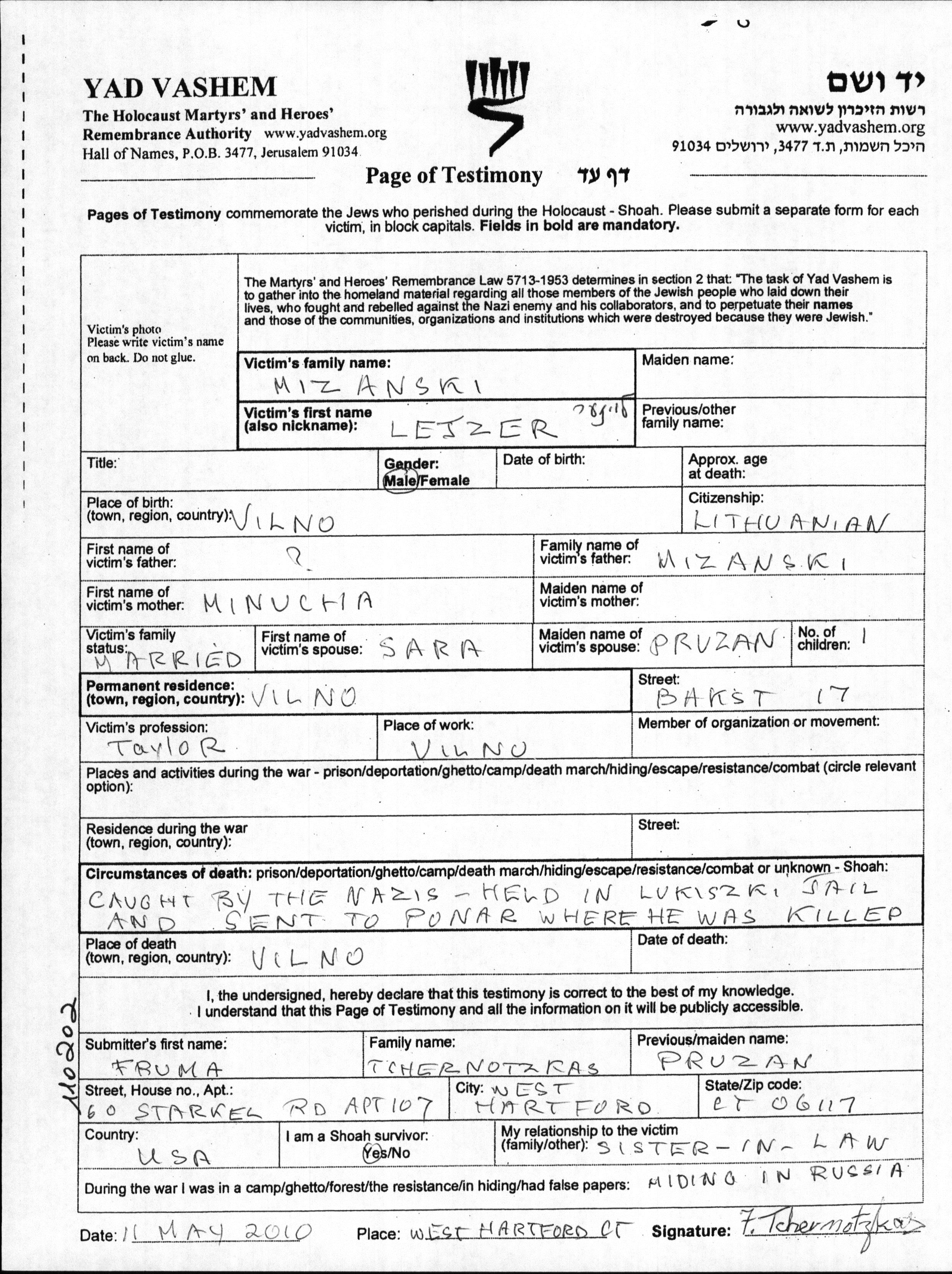 Lejzer Mizanski wurde in Wilno, Polen geboren. Er war der Sohn von Minucha. Er war Taylor und mit Sara, geb. Pruzan Verheiratet. Vor dem Zweiten Weltkrieg lebte er in Wilno, Polen. Während des Krieges war er in Lukiszki, Polen.