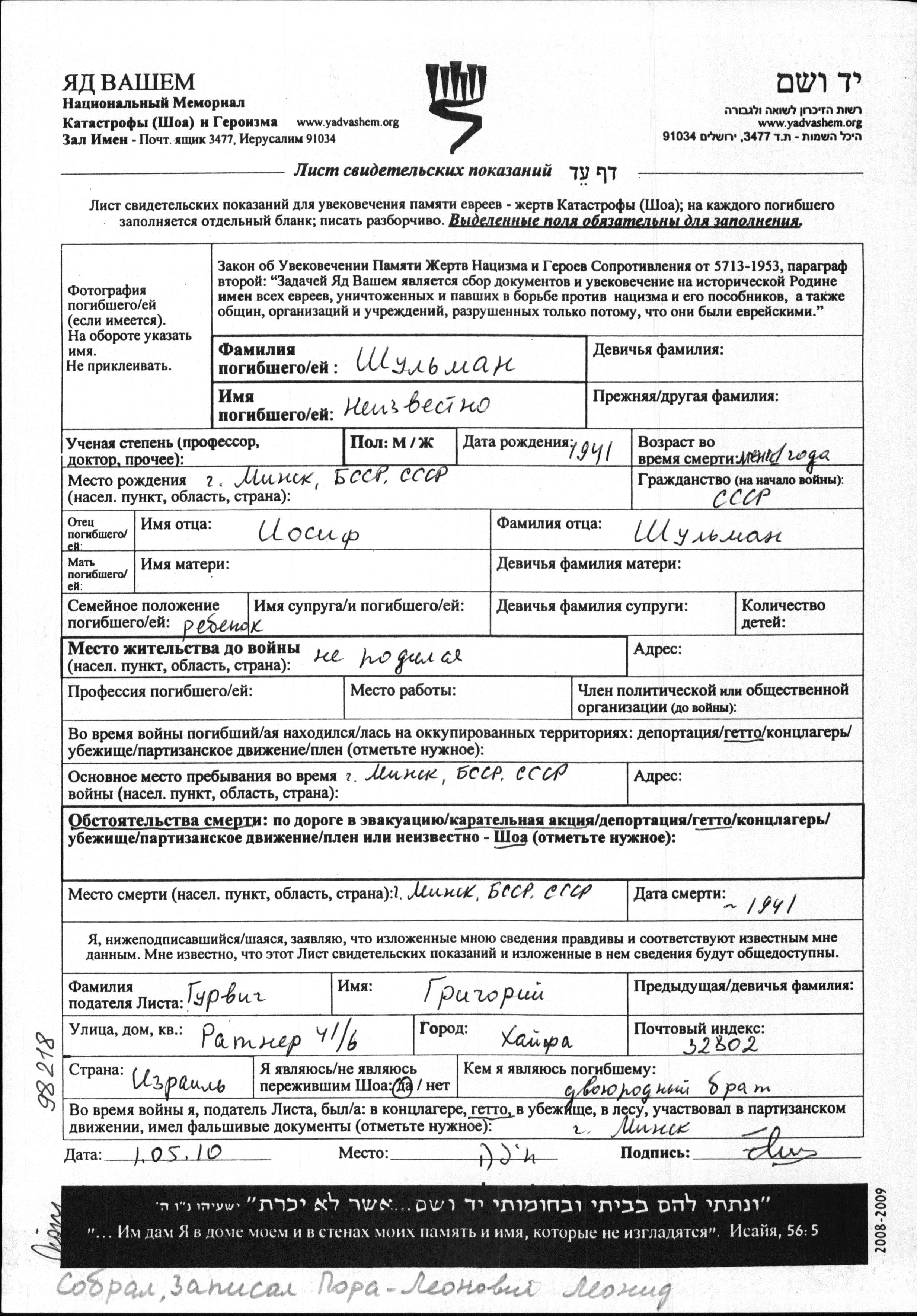 Juden wurden in der Schoah auf verschiedenste Weisen ermordet, unter anderem: Vergasen, Erschiessen, lebendig verbrannt werden, lebendig begraben werden, Tod durch Erschöpfung durch Zwangsarbeit, Epidemien, mangels jeder hygienischer Bedingung oder dem Fehlen medizinischer Versorgung. Manche Juden nahmen sich das Leben, um der Festnahme und weiterer Verfolgung zu entgehen oder ihr hoffnungsloses, nicht nachlassendes Leiden zu beenden.