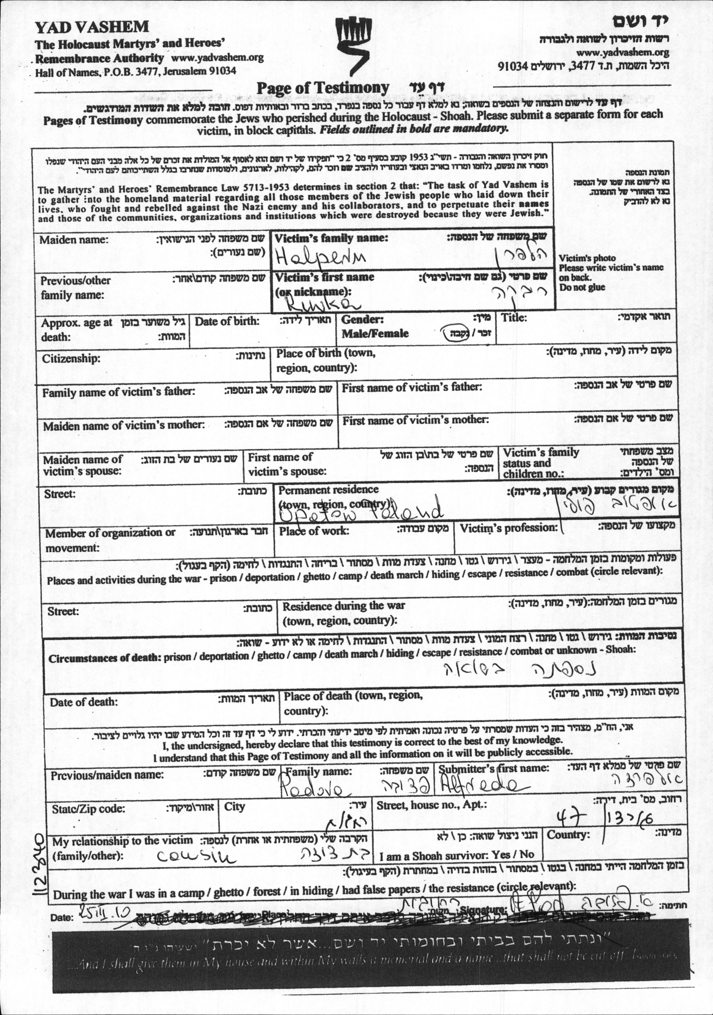 Riwka wurde in der Schoah ermordet.