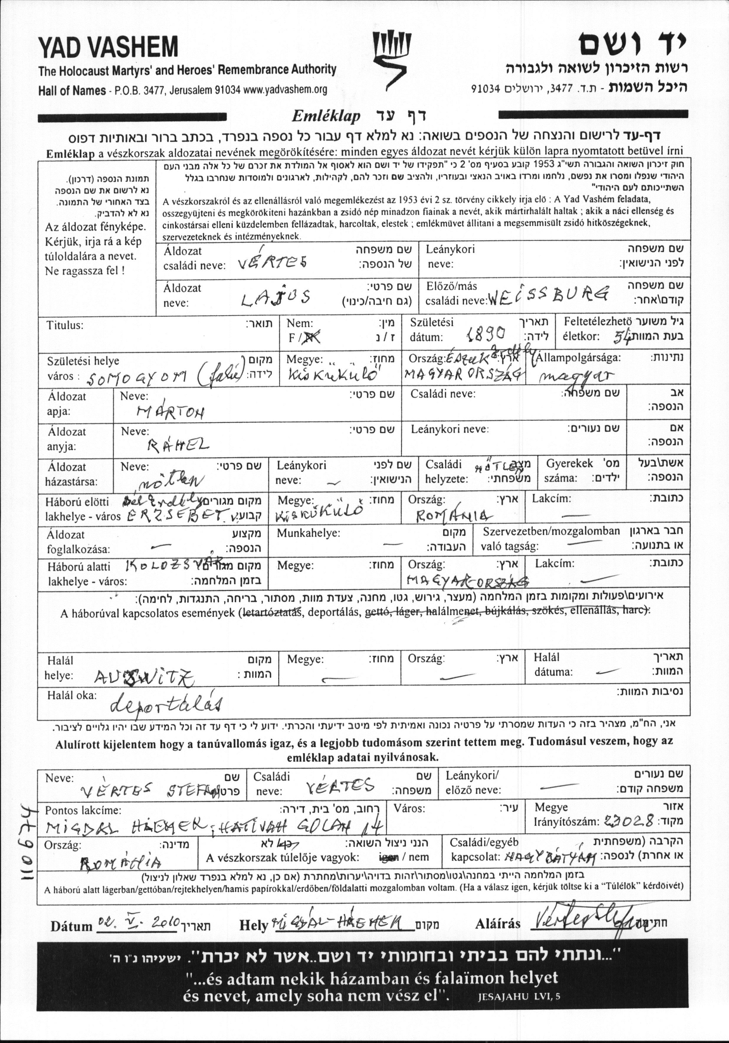 Lajos Vertes Weissburg wurde im Jahr 1890 in Somogyom, Rumänien geboren. Er war der Sohn von Marton und Rahel. Er war Ledig. Vor dem Zweiten Weltkrieg lebte er in Erzsebetvaros, Rumänien. Während des Krieges war er in Kolozsvar, Rumänien.