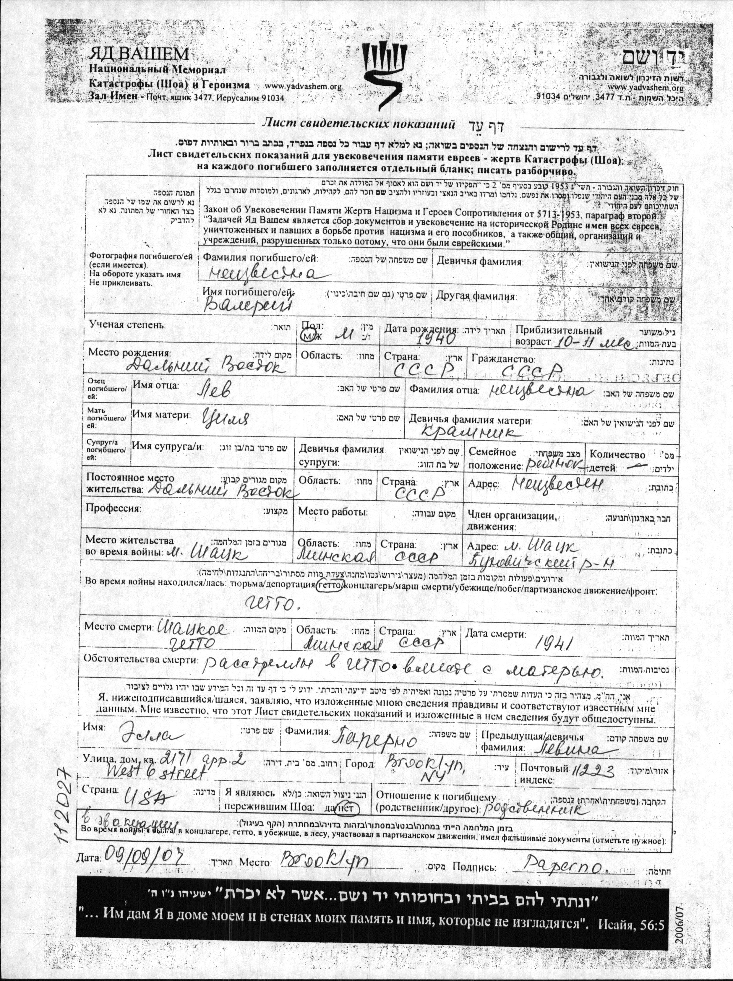 Valeri wurde in der Schoah ermordet. Todesort: Shatsk, Weißrussland (UdSSR) im Jahr 1941.