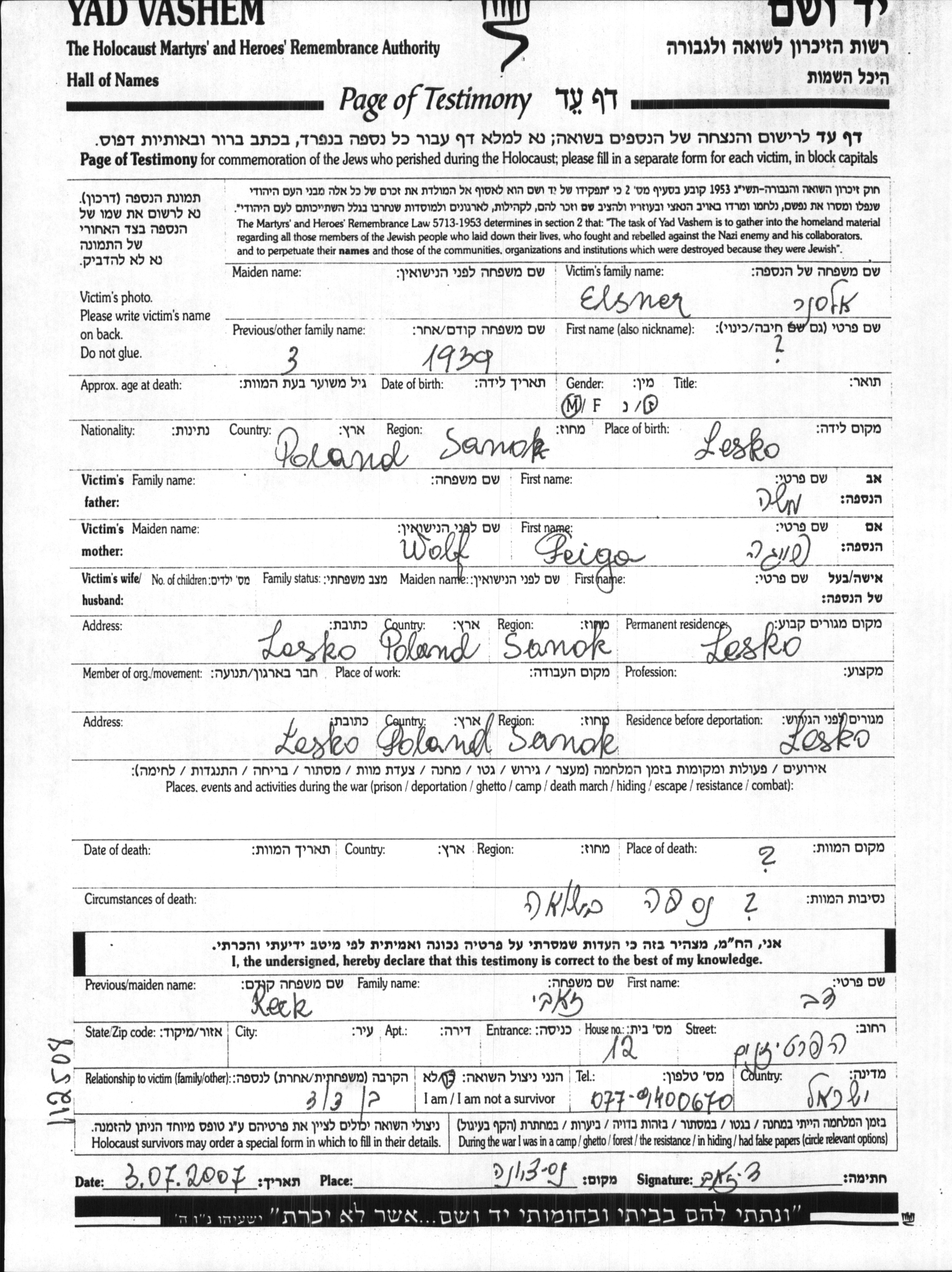 Vorname unbekannt Elsner wurde im Jahr 1939 in Lesko, Polen geboren. Er war der Sohn von Moshe und Feiga, geb. Wolf. Er war Kind. Vor dem Zweiten Weltkrieg lebte er in Lesko, Polen. Während des Krieges war er in Lesko, Polen.
