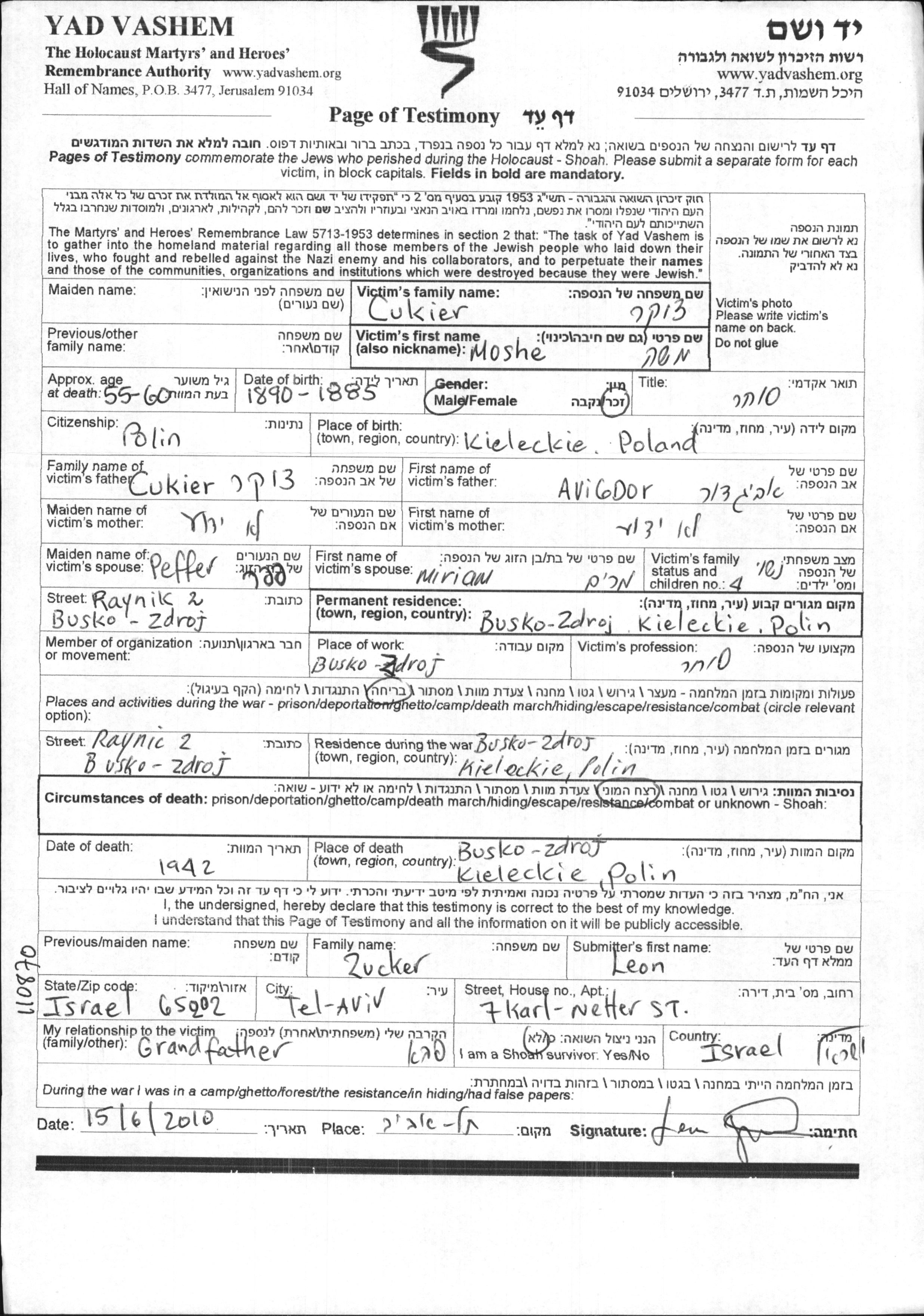 Moshe Cukier wurde in Kielce, Polen geboren. Er war der Sohn von Avigdor. Er war Kaufmann/-frau und mit Miriam, geb. Peffer Verheiratet. Vor dem Zweiten Weltkrieg lebte er in Busko Zdroj, Polen. Während des Krieges war er in Busko Zdroj, Polen.