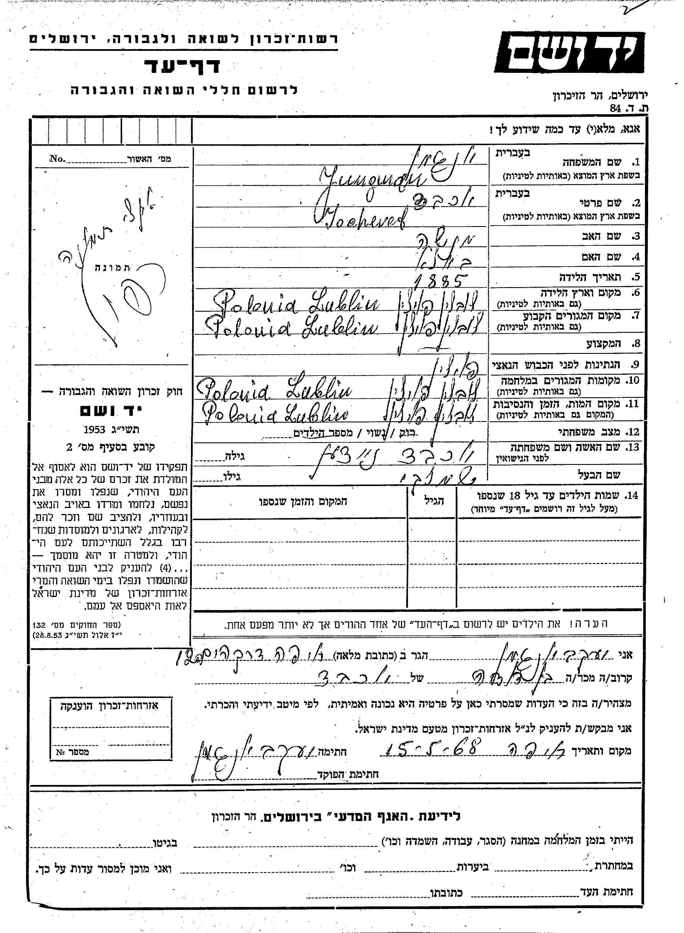Jochevet wurde in der Schoah ermordet. Todesort: Lublin, Polen.