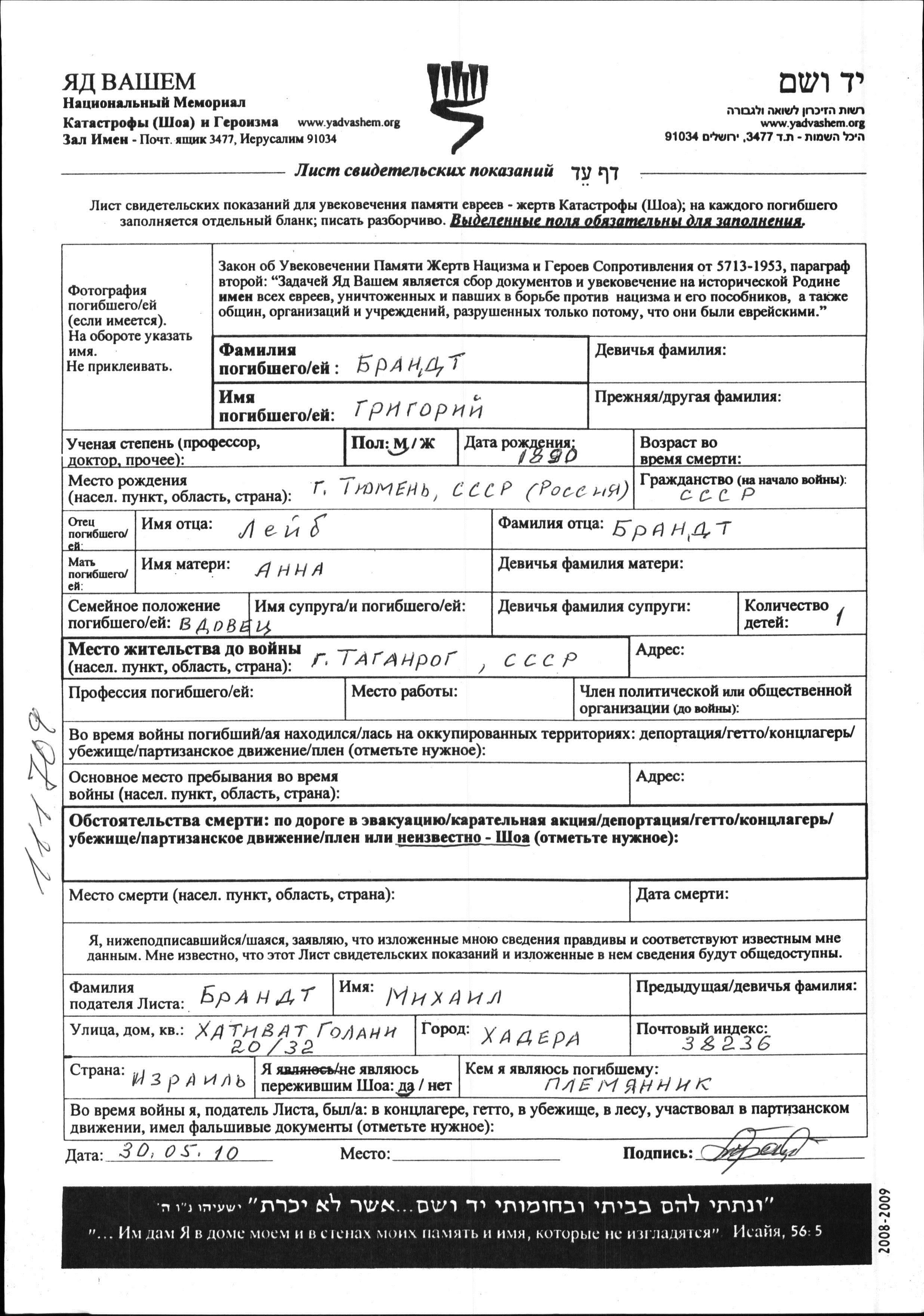 Grigoriy Brandt wurde im Jahr 1890 in Tyumen, Russland (UdSSR) geboren. Er war der Sohn von Leyb und Anna. Er war Witwer. Vor dem Zweiten Weltkrieg lebte er in Taganrog, Russland (UdSSR).