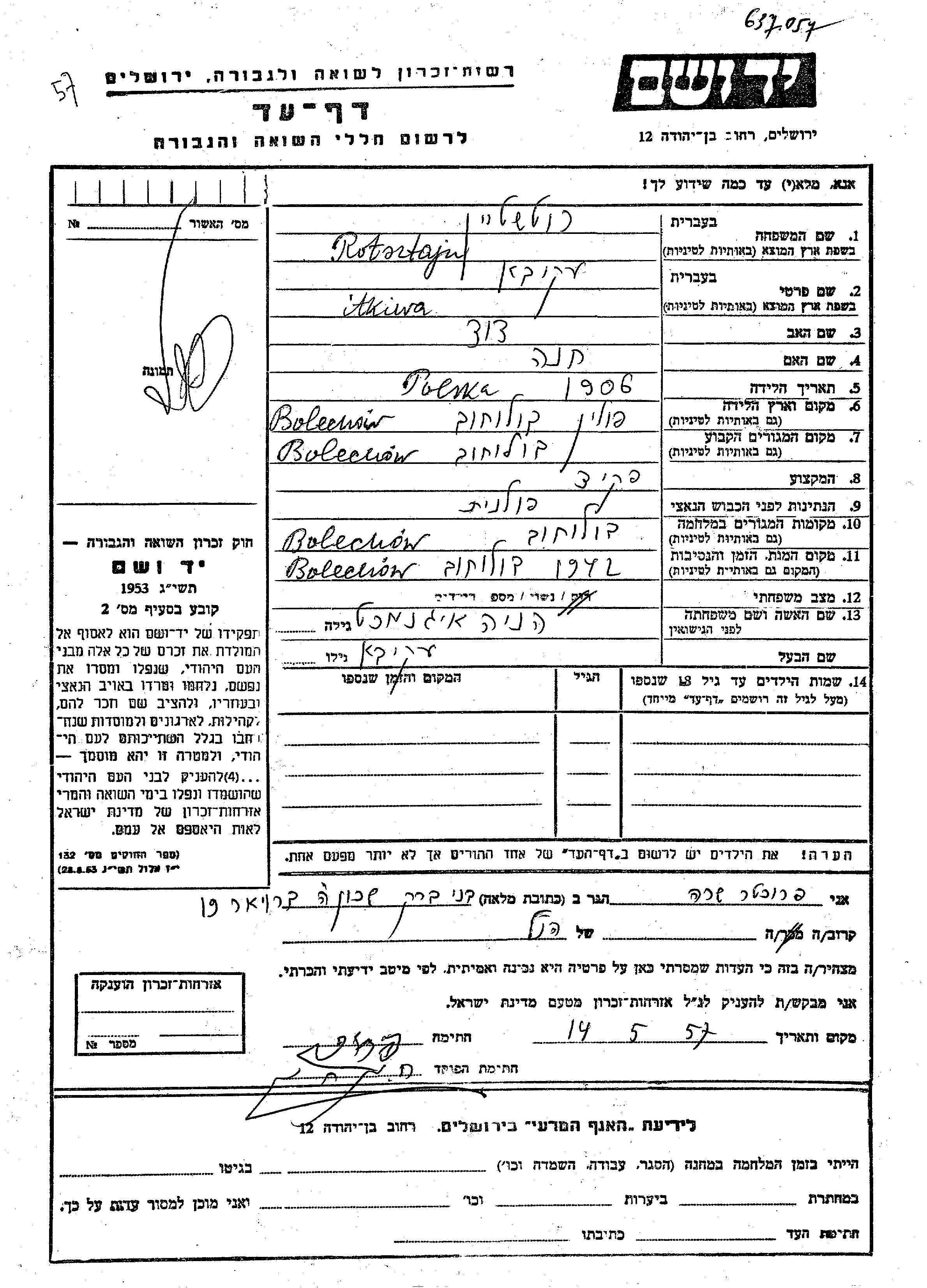 Akiwa Rotsztajn wurde im Jahr 1906 in Bolechow, Polen geboren. Er war der Sohn von David und Khana. Er war Angestellte/-r und mit Henia, geb. Eigenmakht Verheiratet. Vor dem Zweiten Weltkrieg lebte er in Bolechow, Polen. Während des Krieges war er in Bolechow, Polen.